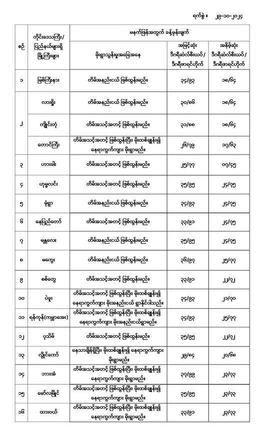 မနက်ဖြန်အတွက် တိုင်းဒေသကြီးနှင့် ပြည်နယ်များရှိ မြို့ကြီးများ၏ အမြင့်ဆုံးအပူချိန်၊ အနိမ့်ဆုံးအပူချိန်နှင့် မိုးလေဝသခန့်မှန်းချက်