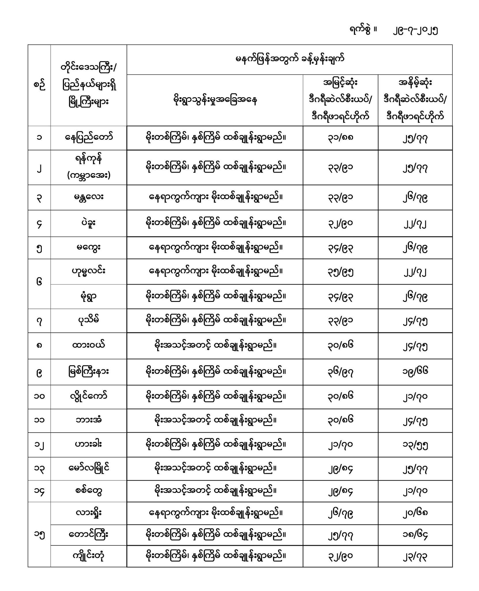 မနက်ဖြန်အတွက် တိုင်းဒေသကြီးနှင့် ပြည်နယ်များရှိ မြို့ကြီးများ၏ အမြင့်ဆုံးအပူချိန်၊ အနိမ့်ဆုံးအပူချိန်နှင့် မိုးလေဝသခန့်မှန်းချက်