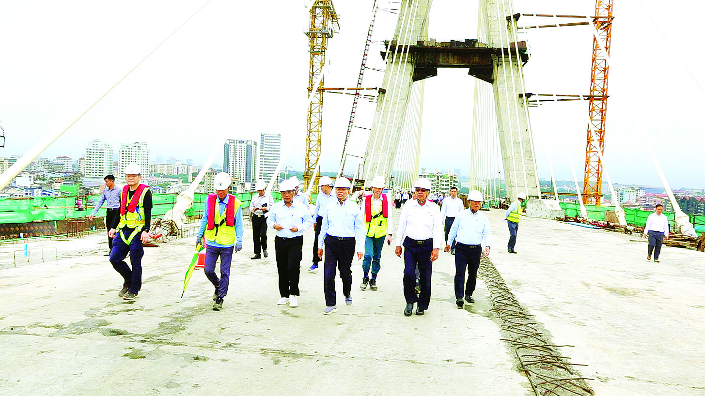 ဦးစွာ ပြည်ထောင်စုဝန်ကြီး၊ တိုင်းဒေသကြီး ဝန်ကြီးချုပ်နှင့်အဖွဲ့သည် တံတားတည်ဆောက်ရေး စီမံကိန်းလုပ်ငန်းခွင်၏ ရန်ကုန်ဘက်ခြမ်းသို့ သွားရောက်၍ ဘုန်းကြီးလမ်းတစ်လျှောက် ချဉ်းကပ်တံတား တစ်ဖက်တစ်ချက်တွင် ပတ်ဝန်းကျင်လူနေအိမ်ရာများအတွက် မော်တော်ယာဉ်များ၏ ဆူညံသံများ အနှောင့်အယှက်မဖြစ်စေရေး အသံထိန်းနံရံများ (Noise Barrier) တပ်ဆင်ပြီးစီးမှုအခြေအနေ၊ ပင်မတံတားနှင့်ဆုံသည့်နေရာ၌ ပင်မတံတား တွဲဆက်နိုင်ရန် ကြိုးဆိုင်းများ တပ်ဆင်ပြီးစီးမှု၊ နောက်ဆုံးအဆင့် တံတားတွဲဆက်ခြင်းများ ဆောင်ရွက်နိုင်ရန် ကြိုတင် ပြင်ဆင်နေမှုနှင့် ဆက်လက်ဆောင်ရွက်နေသည့် လုပ်ငန်းအခြေအနေတို့ကို တာဝန်ရှိသူများက ရှင်းလင်းတင်ပြရာ ပြည်ထောင်စုဝန်ကြီးနှင့် ရန်ကုန်တိုင်းဒေသကြီးဝန်ကြီးချုပ်တို့က လုပ်ငန်းလိုအပ် ချက်များမှာကြားပြီး လုပ်ငန်းခွင်အတွင်း အသေးစိတ်လိုက်လံ ကြည့်ရှုစစ်ဆေးသည်။