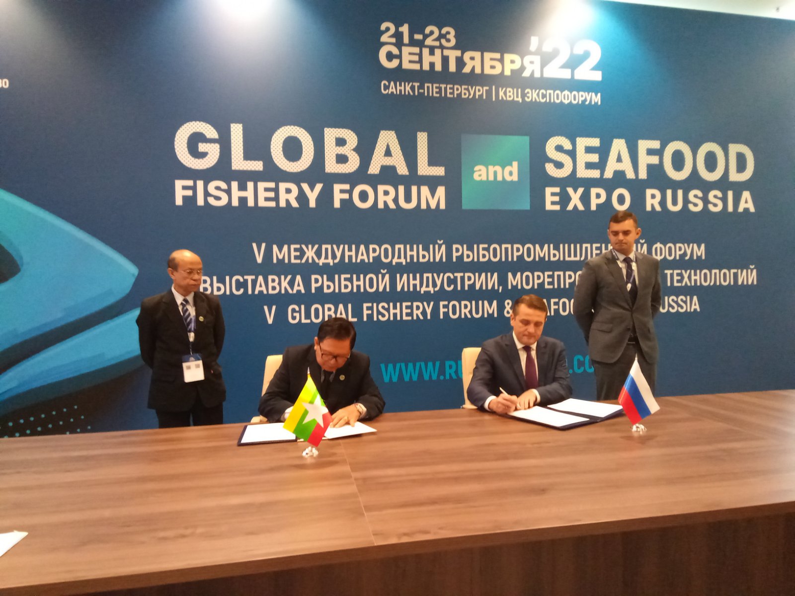 စက်တင်ဘာ (၂၂)ရက်တွင် ကျင်းပသည့် အပြည်ပြည်ဆိုင်ရာ ငါးလုပ်ငန်းဖိုရမ်နှင့် ရေထွက် ကုန်ပြပွဲ၌ စိုက်ပျိုးရေး၊ မွေးမြူရေးနှင့် ဆည်မြောင်းဝန်ကြီးဌာန ဒုတိယဝန်ကြီး ဒေါက်တာ အောင်ကြီးနှင့် ရုရှားနိုင်ငံ Federal Fishery Agency of Russia အဖွဲ့ အကြီးအကဲ Mr.Ilya Shestakov တို့က  မြန်မာ- ရုရှား နှစ်နိုင်ငံအကြား ငါးလုပ်ငန်း ပူးပေါင်းဆောင်ရွက်မှု အကျိုးဖြစ်ထွန်းစေမည့် ကိစ္စများအပါအဝင် ရေထွက်ကုန် အကျိုးဖြစ်ထွန်းစေမည့်ကဏ္ဍတွင် နှစ်နိုင်ငံပူးပေါင်း ဆောင်ရွက်ရေးဆိုင်ရာ သဘောတူစာချုပ်ကို လက်မှတ်ရေးထိုးကြသည်။