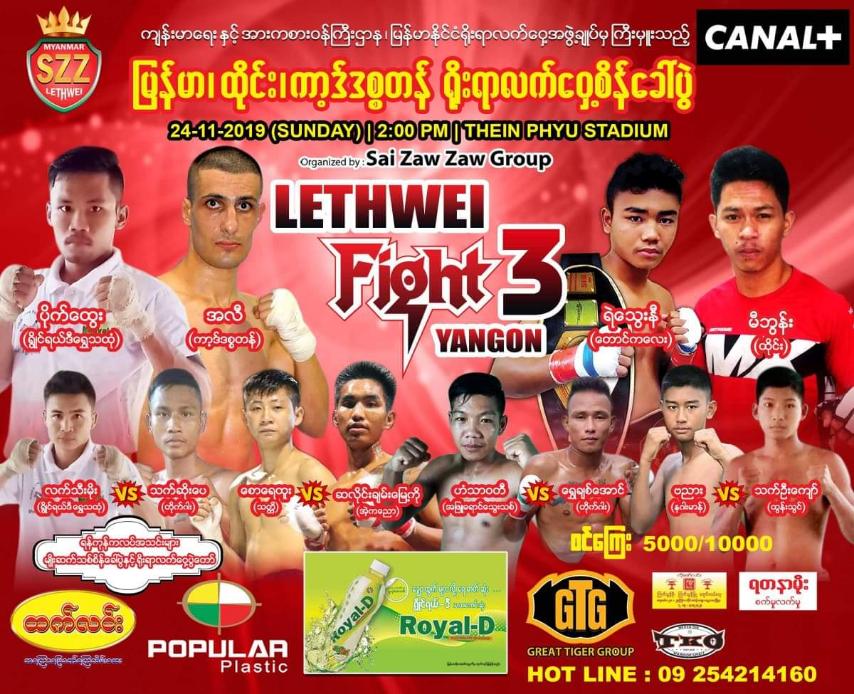 ကျန်းမာရေးနှင့် အားကစားဝန်ကြီးဌာန မြန်မာနိုင်ငံရိုးရာ လက်ဝှေ့အဖွဲ့ချုပ်မှကြီးမှူးပြီး စိုင်းဇော်ဇော် Group မှ စီစဉ်သော မြန်မာ-ထိုင်း-ကာ့ဒ်ဒစ္စတန် ရိုးရာလက်ဝှေ့စိန်ခေါ်ပွဲ (LETHWEI Fight 3) ကို ရန်ကုန်မြို့ သိမ်ဖြူအားကစားရုံ (Yangon Thein Phyu Stadium) တွင် နိုဝင်ဘာ ၂၄ ရက် မွန်းလွဲ ၂ နာရီတွင် ကျင်းပမည်ဖြစ်ကြောင်း သိရသည်။