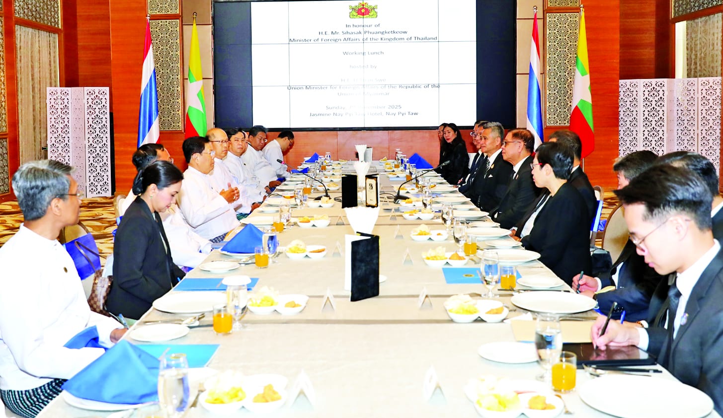 နိုင်ငံခြားရေးဝန်ကြီးဌာန ပြည်ထောင်စုဝန်ကြီး ဦးသန်းဆွေသည် ယနေ့တွင် နေပြည်တော်သို့ နေ့ချင်းပြန်ခရီးလာရောက်ခဲ့သည့် ထိုင်းနိုင်ငံခြားရေးဝန်ကြီး H.E. Mr. Sihasak Phuangketkeow နှင့် တွေ့ဆုံဆွေးနွေးပြီး ၎င်းနှင့်ကိုယ်စားလှယ်အဖွဲ့အား Jasmine Nay Pyi Taw Hotel ၌ အလုပ်သဘောနေ့လယ်စာဖြင့် တည်ခင်းဧည့်ခံသည်။
