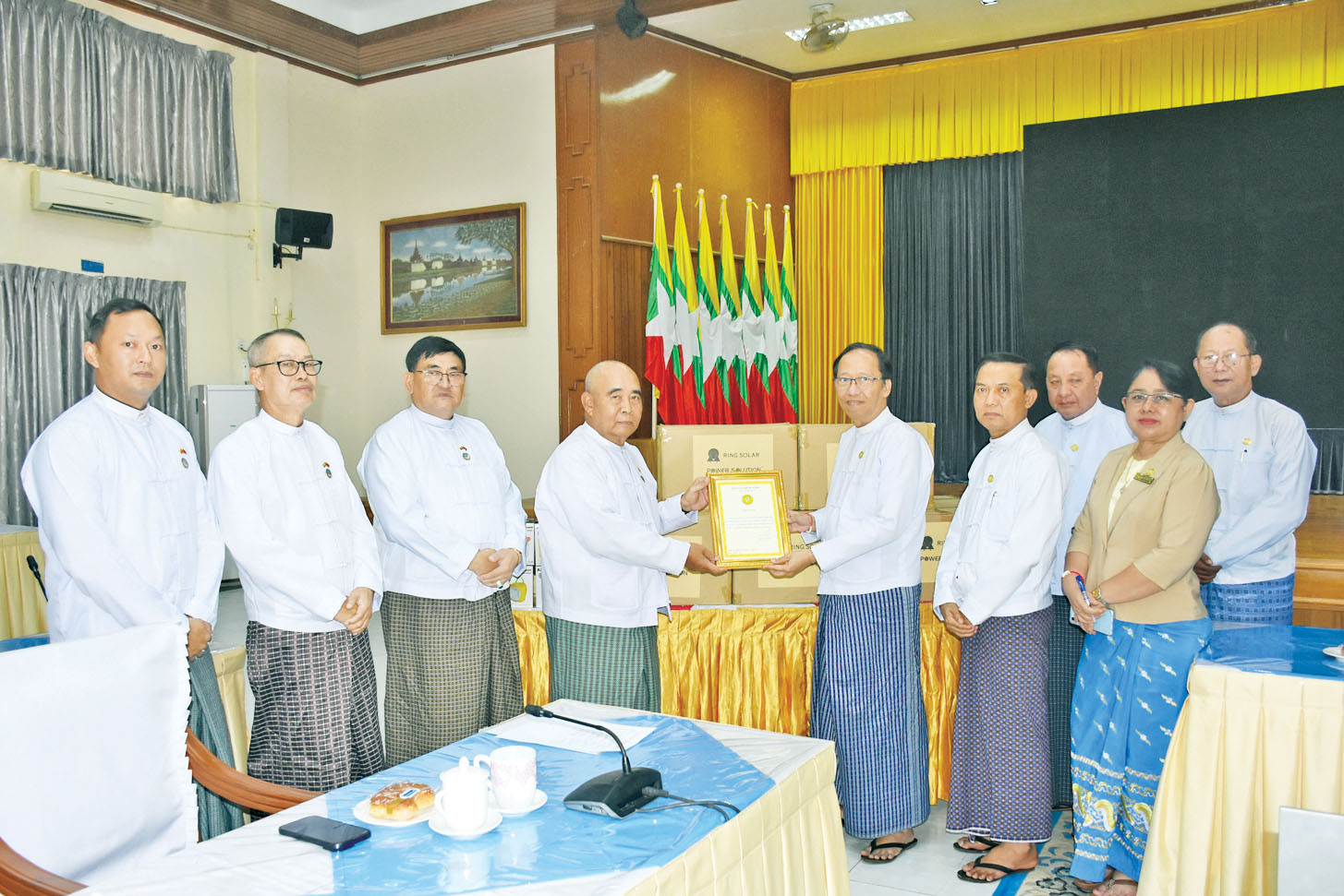 ထို့အတူ မြန်မာ-တရုတ်ချစ်ကြည်ရေးအသင်း (ဗဟို)ဥက္ကဋ္ဌသည် သိပ္ပံနှင့်နည်းပညာဝန်ကြီးဌာနမှ ဝန်ထမ်းမိသားစုများအတွက် အိမ်သုံးဆိုလာပစ္စည်းအစုံ ၁၀၀ ကို အဆိုပါဝန်ကြီးဌာနသို့ လာရောက် ပေးအပ်လှူဒါန်းရာ ပြည်ထောင်စုဝန်ကြီး ဒေါက်တာ မျိုးသိန်းကျော်က လက်ခံရယူပြီး ကျေးဇူးတင်စကား ပြောကြားကာ ဂုဏ်ပြုမှတ်တမ်းလွှာ ပြန်လည်ပေးအပ်သည်။