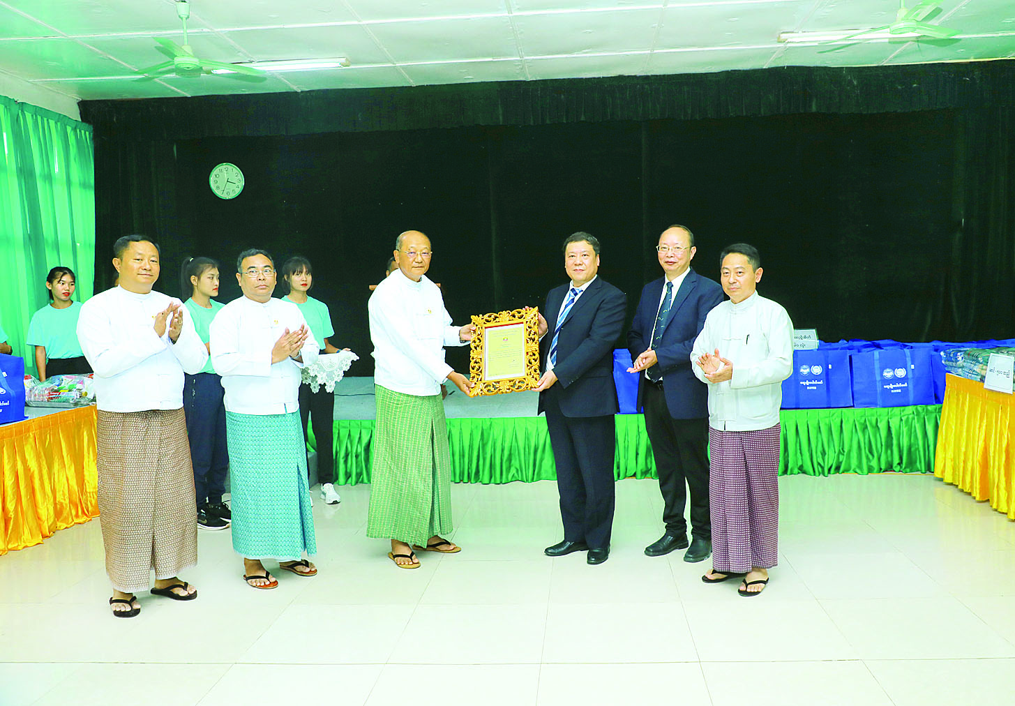ထို့နောက် မြန်မာ - တရုတ်ပူးပေါင်းဆက်ဆံရေးအသင်းမှ တာဝန်ရှိသူများက ပြည်ထောင်စုဝန်ကြီးနှင့် ဒုတိယဝန်ကြီးများထံ လှူဒါန်းပစ္စည်းများကို ပေးအပ်ပြီး ပြည်ထောင်စုဝန်ကြီးက အလှူရှင် များအား ဂုဏ်ပြုမှတ်တမ်းလွှာများ ပြန်လည်ပေးအပ်သည်။