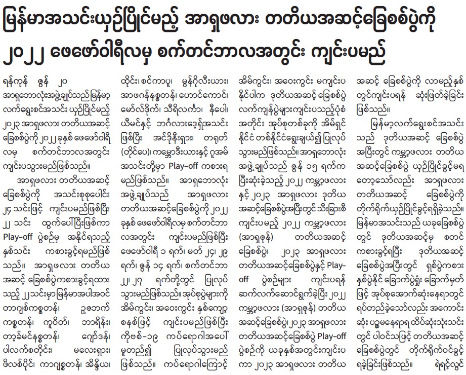 မြန်မာအသင်းယှဉ်ပြိုင်မည့် အာရှဖလား တတိယအဆင့်ခြေစစ်ပွဲကို ၂၀၂၂ ဖေဖော်ဝါရီလမှ စက်တင်လဘာလအတွင်း ကျင်းပမည်