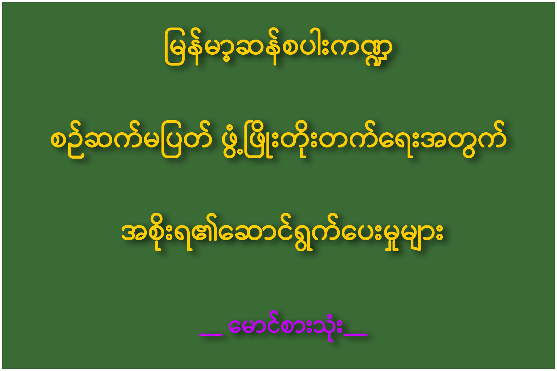 မြန်မာနိုင်ငံ၏ အဓိကထုတ်ကုန်သည် ဆန်စပါးဖြစ်သည်။ ဆန်စပါးသည် မြန်မာနိုင်ငံဖွံ့ဖြိုးတိုးတက်ရေး၏ အသက်သွေးကြောဖြစ်သည်။ ထို့ကြောင့်ပင် အစိုးရအဆက်ဆက်၏ ဦးတည်ချက်များတွင် စိုက်ပျိုးရေးကိုအခြေခံ၍ဟူသည့် ဦးတည်ချက်အမြဲပါဝင်သည်ကို သတိထားမိသည်။ မြေသည် တိုးပွားလာသည် မဟုတ်ပေ။ နေထိုင်သည့်ဦးရေသာ တိုးပွားလာနေသည်။ တိုးပွားလာသည့် လူဦးရေ အတွက် ရိက္ခာလုံလောက်မှုရှိစေရန် ဆန်စပါးကဏ္ဍကို သမားရိုးကျပုံစံများအတိုင်း ဆောင်ရွက်နေ၍မဖြစ်ပေ။ စဉ်ဆက် မပြတ် ဖွံ့ဖြိုးတိုးတက်ရေးအတွက် အစိုးရ၊ ပုဂ္ဂလိက၊ တောင်သူများ ပူးပေါင်း၍ ကြံဆဆောင်ရွက်သွားရမည် ဖြစ်ပါသည်။ စက်မှုလယ်ယာ စနစ် ကူးပြောင်းရမည်၊ တစ်သီးစားမှ နှစ်သီးစား၊ သုံးသီးစားဖြစ်အောင် လုပ်ရမည်၊ အထွက်တိုးအောင်လုပ်ရမည်၊ ခေတ်မီနည်းပညာများ သုံးစွဲရမည်။ သို့မှသာ ပြည်တွင်းရိက္ခာဖူလုံသည့်အပြင် ပိုလျှံသည့် ဆန်နှင့် ဆန်ထွက်ပစ္စည်းများကို ပြည်ပသို့အရည်အသွေးပြည့်မီစွာ တင်ပို့ရောင်းချခြင်းဖြင့် နိုင်ငံတော်ဖွံ့ဖြိုးတိုးတက်ရေးအတွက် အထောက်အကူပြုနိုင်မည်ဖြစ်ပါသည်။