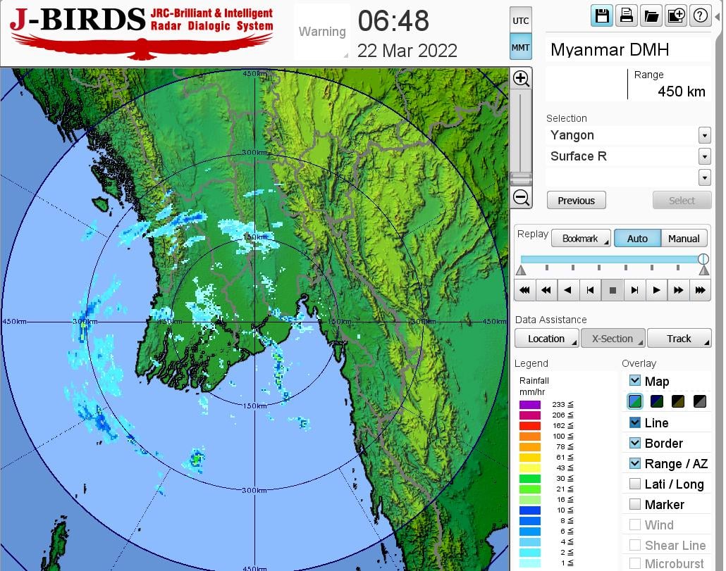 ယနေ့ညနေအထိ ခန့်မှန်းချက်အနေဖြင့် ရန်ကုန်တိုင်းဒေသကြီး၊ ဧရာဝတီတိုင်းဒေသကြီး၊ တနင်္သာရီတိုင်းဒေသကြီး၊ ရှမ်းပြည်နယ် (တောင်ပိုင်းနှင့် အရှေ့ပိုင်း) ၊ ရခိုင်ပြည်နယ်၊ ကယားပြည်နယ်၊ ကရင်ပြည်နယ်နှင့် မွန်ပြည်နယ်တို့တွင် နေရာအနှံ့အပြား၊ နေပြည်တော်၊ မကွေးတိုင်းဒေသကြီးနှင့် ပဲခူးတိုင်းဒေသကြီးတို့တွင် နေရာစိပ်စိပ်၊ မန္တလေးတိုင်းဒေသကြီးနှင့် ရှမ်းပြည်နယ် (မြောက်ပိုင်း) တို့တွင် နေရာကျဲကျဲနှင့် ကျန်တိုင်းဒေသကြီးနှင့် ပြည်နယ်တို့တွင် နေရာကွက်ကျား မိုးထစ်ချုန်းရွာပြီး၊ ဧရာဝတီတိုင်းဒေသကြီးနှင့် ရခိုင်ပြည်နယ်တို့တွင် ဒေသအလိုက်နှင့် မကွေးတိုင်းဒေသကြီး၊ ပဲခူးတိုင်းဒေသကြီး၊ ရန်ကုန်တိုင်းဒေသကြီး၊ တနင်္သာရီတိုင်းဒေသကြီး၊ ကရင်ပြည်နယ်နှင့် မွန်ပြည်နယ်တို့တွင် နေရာကွက်၍ မိုးကြီးနိုင်သည်။ ရွာရန်ရာနှုန်း (၈၀) ဖြစ်သည်။