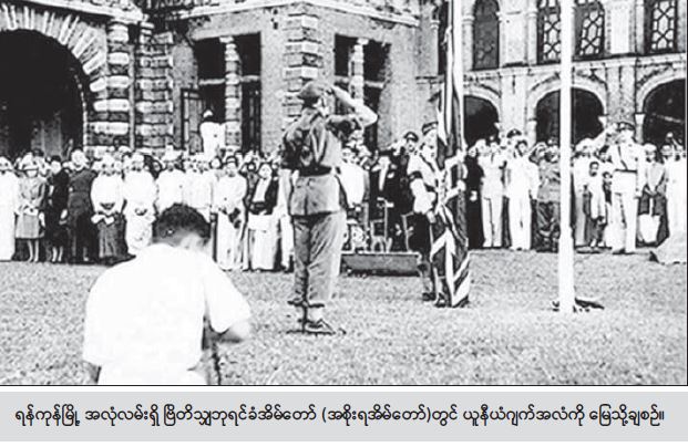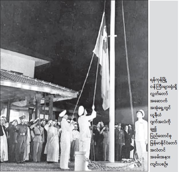 မှတ်တမ်းတင် ရုပ်ရှင်ရိုက်ကူးရေးအဖွဲ့က အသင့်ဖွင့်ထားသည့် မီးမောင်းကြီးများမှ ထွန်းလင်းတောက် ပနေသည့် မီးရောင်အောက်တွင် အလံတင်အခမ်းအနားကြီးမှာ အထူးစိတ်ဝင်စား စိတ်လှုပ်ရှားဖွယ်ဖြစ်သည်။ လွှတ်တော်ရှေ့နေရာတွင်ဆိုင်ရာဆိုင်ရာ နိုင်ငံတော်အလံကို ရုပ်သိမ်းခြင်း၊ လွှင့်ထူခြင်း ပြုလုပ်ရန် အဆင်သင့်စောင့်ဆိုင်းနေကြသည့် မြန်မာ့ရေတပ်မတော်သားများနှင့် ဗြိတိသျှရေတပ်မတော်သားများသည် နံနက် ၄ နာရီ မိနစ် ၂၀ အချိန် အမြောက်ပစ်သံများ ပေါ်ထွက်လာသည် နှင့် နှစ်ပေါင်း တစ်ရာကျော် မြန်မာ့မြေတွင် တလူလူလွှင့်ထူခဲ့သည့် အလံတိုင်ထိပ်ဖျားမှ ယူနီယံဂျက်အလံကို တဖြည်းဖြည်းလျှော့ချမြေသို့ကျစေပြီး တစ်ချိန်တည်းမှာပင် နှစ်ပေါင်းများစွာ မြန်မာ့မြေပေါ်တွင် ပျောက်ကွယ် ခဲ့ရသော ပြည်ထောင်စုမြန်မာနိုင်ငံတော်အလံသည် တိုင်ထိပ်ဖျားသို့ တလူလူထိုးတက်၍ တလွင့်လွင့်ဖြင့် အောင်လံလွှင့်ထူနိုင်ခဲ့သည်။