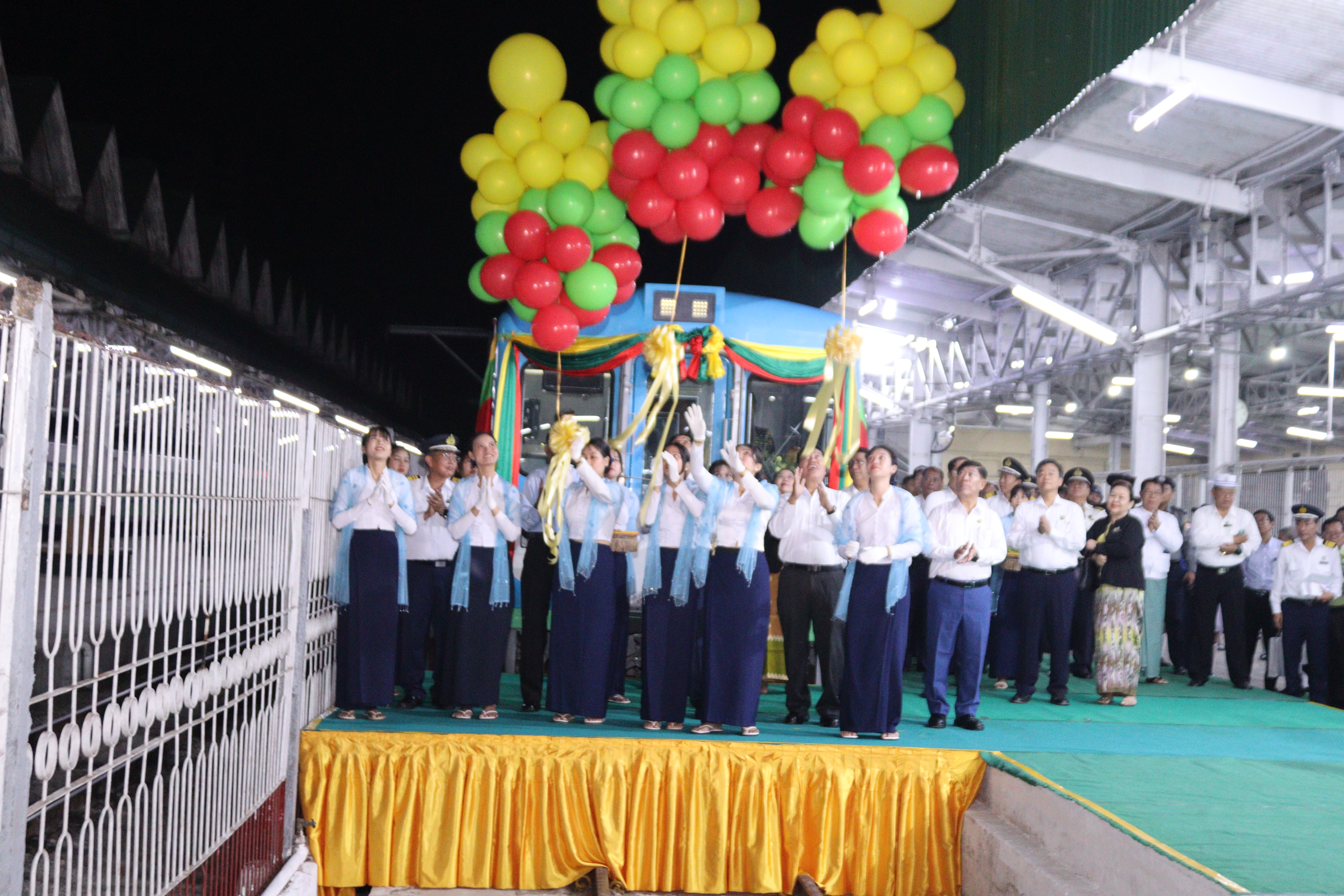 ထို့နောက် တိုင်းဒေသကြီးအစိုးရအဖွဲ့ ဝန်ကြီးချုပ်၊ ပို့ဆောင်ရေးနှင့်ဆက်သွယ် ရေးဝန်ကြီးဌာန ဒုတိယဝန်ကြီး နှင့် တာဝန်ရှိသူများက ရထားတွဲဆိုင်းသစ်ကို ဖဲကြိုးဖြတ်ဖွင့်လှစ် ပေးပြီး အမွှေးနံ့သာများပက်ဖျန်းပေးကာ နေပြည်တော်သို့ လိုက်ပါကြမည့် ခရီးသည်များအား ရထားပေါ်၌ ရင်းနှီးစွာလိုက်လံနှုတ်ဆက်၍ စားသောက် ဖွယ်ရာများ ပေးအပ်ကြသည်။အဆိုပါ ရထားသည် နံနက် ၆ နာရီတွင် ရန်ကုန်ဘူတာကြီးမှ စတင်ထွက်သည်။