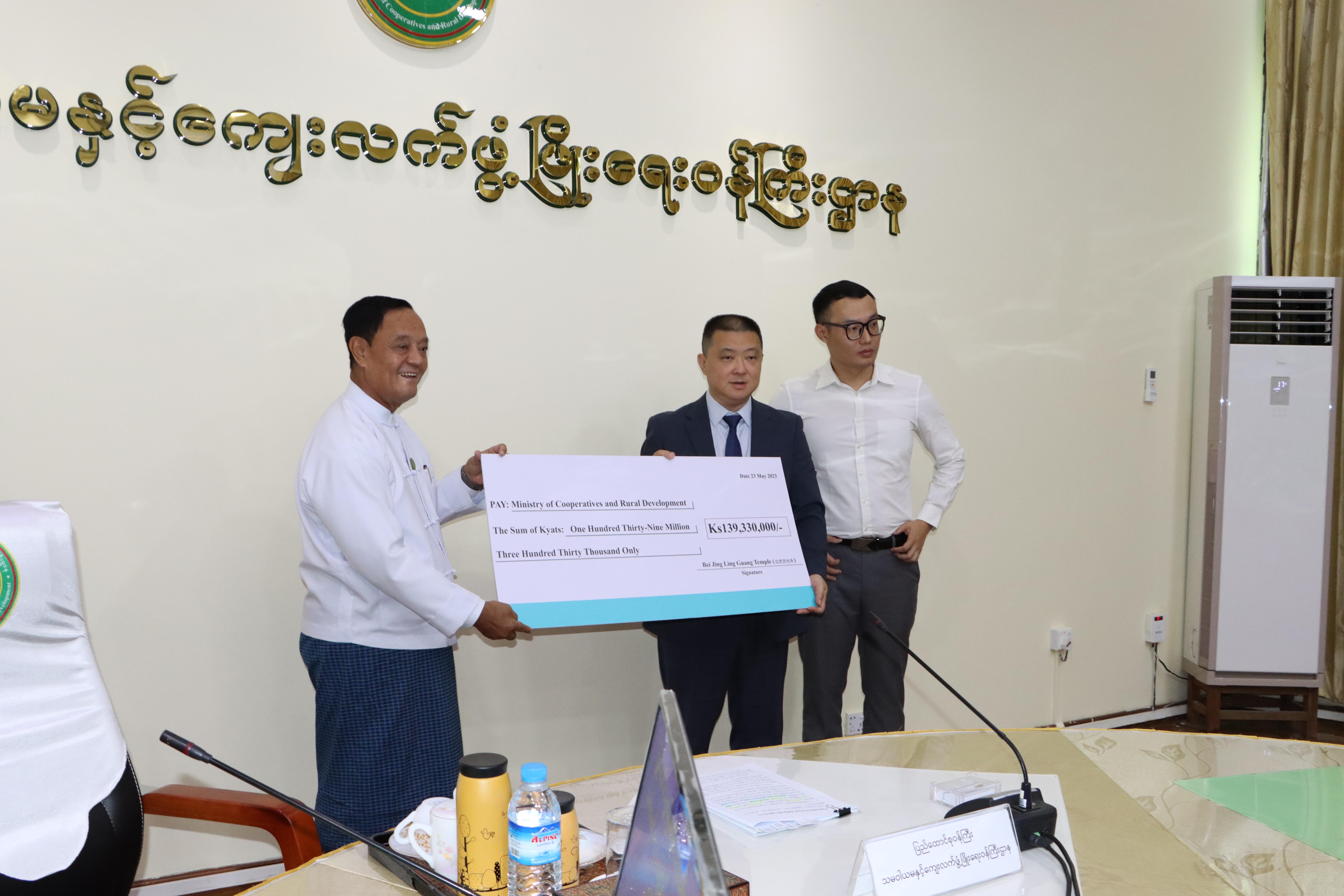 ရှေးဦးစွာ တရုတ်ပြည်သူ့သမ္မတနိုင်ငံ၊ ပေကျင်းမြို့ရှိ လင်ကွန်ကျောင်းတိုက် ဆရာတော်ချန်ကျန့်မှ မြန်မာနိုင်ငံရှိ ကျေးရွာ (၅) ရွာအတွက် စက်ရေတွင်းရေကန်များ တူးဖော်ဆောက်လုပ် လှူဒါန်းလိုသည့် အကြောင်းအရင်းအား ကိုယ်စားလှယ်အဖွဲ့ခေါင်းဆောင် Mr. Liu Wei မှ ရှင်းလင်း ပြောကြားပြီး အလှူငွေများ ပေးအပ်လှူဒါန်းရာ သမဝါယမနှင့် ကျေးလက်ဖွံ့ဖြိုးရေးဝန်ကြီးဌာန၊ ပြည်ထောင်စုဝန်ကြီး ဦးလှမိုးက လက်ခံရယူခဲ့ပြီး ဂုဏ်ပြုမှတ်တမ်းလွှာ ပြန်လည်ပေးအပ်သည်။