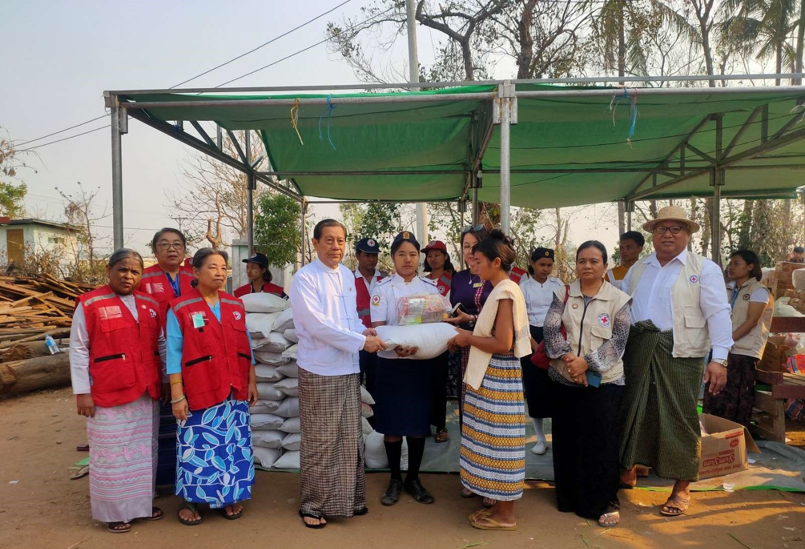 ပြည်ထောင်စုနယ်မြေ နေပြည်တော် လယ်ဝေးမြို့နယ်တွင် လေဆင်နှာမောင်းတိုက် ခတ်မှုဖြစ်ပွား ခဲ့သော တံတားဦးကျေးရွာနှင့် အောင်မြင်ကုန်းကျေးရွာတို့မှ ဒေသခံရွာသူရွာ သားများကို မြန်မာနိုင်ငံ ကြက်ခြေနီအသင်းမှ အခြေခံစားသောက်ကုန်များ ထောက်ပံ့ပေးအပ်ပွဲကို ယနေ့ နံနက်ပိုင်းက အဆိုပါကျေးရွာများတွင် ပြုလုပ်ခဲ့ရာ မြန်မာနိုင်ငံ ကြက်ခြေနီအသင်းဥက္ကဋ္ဌ ဒေါက်တာမျိုးညွန့် တက်ရောက်ခဲ့ပြီး လေဘေးသင့်ပြည်သူများကို အခြေခံစားသောက်ကုန်များ ထောက်ပံ့ပေးအပ်ခဲ့ပြီး ရင်းရင်းနှီးနှီး အားပေးစကား ပြောကြားသည်။