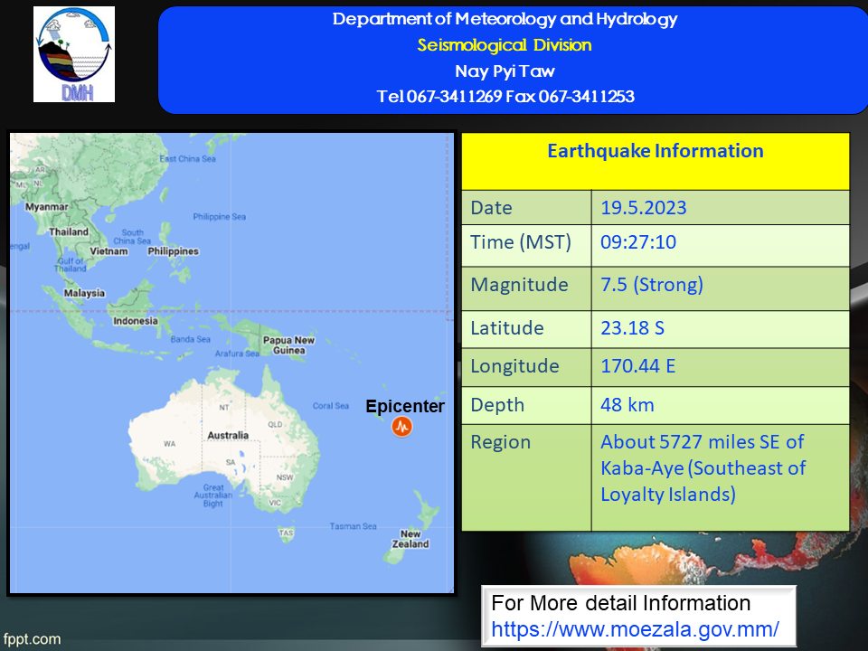 ၂၀၂၃ ခုနှစ်၊ မေလ(၁၉)ရက်နေ့၊ မြန်မာစံတော်ချိန် (၀၉)နာရီ၊ (၂၇)မိနစ်၊ (၁၀)စက္ကန့် အချိန်တွင် ကမ္ဘာအေးမြေငလျင်စခန်းမှ အရှေ့တောင်ဘက် (၅၇၂၇) မိုင်ခန့် ကွာဝေးသော မြန်မာနိုင်ငံ ပြည်ပ (Southeast of Loyalty Islands) တောင်လတ္တီတွဒ် (၂၃.၁၈) ဒီဂရီ၊ အရှေ့လောင်ဂျီတွဒ် (၁၇၀.၄၄) ဒီဂရီ၊ အနက် (၄၈) ကီလိုမီတာခန့်ကို ဗဟိုပြု၍ အင်အားရစ်(ခ်)တာစကေး (၇.၅) အဆင့်ရှိ အင်အားပြင်းထန်သော မြေငလျင်တစ်ခု လှုပ်ရှားသွားကြောင်း တိုင်းထွာရရှိပါသည်။