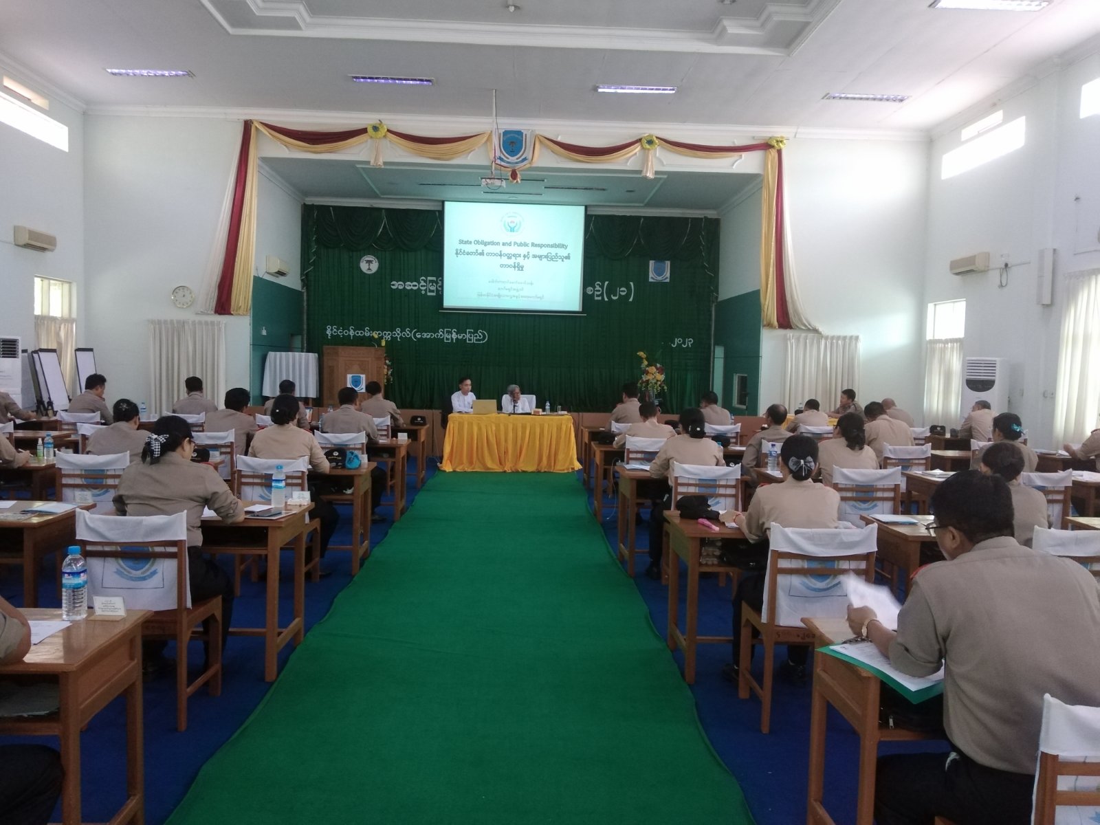 အဆိုပါသင်တန်းတွင် ကော်မရှင်အဖွဲ့ဝင် ဒေါက်တာသန်းမြင့်က လူ့အခွင့်အရေး အခြေခံအယူအဆများအကြောင်း၊ ကမ္ဘာ့လူ့အခွင့်အရေးကြေညာစာတမ်းအကြောင်းနှင့် မြန်မာနိုင်ငံ အမျိုးသားလူ့အခွင့်အရေး ကော်မရှင်ဖွဲ့စည်း ခြင်းနှင့် လုပ်ငန်းဆောင်ရွက်ချက်များ အကြောင်းကိုလည်းကောင်း၊  ကော်မရှင်အဖွဲ့ဝင်ဒေါက်တာ တင်မောင် မောင်သန်းက နိုင်ငံတော်၏တာဝန်ဝတ္တရားနှင့် အများပြည်သူ၏တာဝန်ရှိမှုအကြောင်း၊ ကုလသမဂ္ဂ လူ့အခွင့် အရေးယန္တရားအကြောင်းနှင့် ကမ္ဘာ့နိုင်ငံများ၏ လူ့အခွင့်အရေးအခြေအနေများကို ပုံမှန်သုံးသပ်သည့် လုပ်ငန်းစဉ်အကြောင်း စသည့် ဘာသာရပ်များ ပို့ချသည်။ အဆင့်မြင့်အရာထမ်းသင်တန်းအမှတ်စဉ် (၂၁) သင်တန်း သားဦးရေ (၄၈) ဉီး တက်ရောက်ခဲ့ကြပြီး တက်‌ရောက်လာသော သင်တန်းသားများမှ သိရှိလိုသည့် မေးခွန်းများကို မေးမြန်းကြရာ ကော်မရှင်အဖွဲ့ဝင်များက ပြန်လည်ဖြေကြားခဲ့ကြသည်။