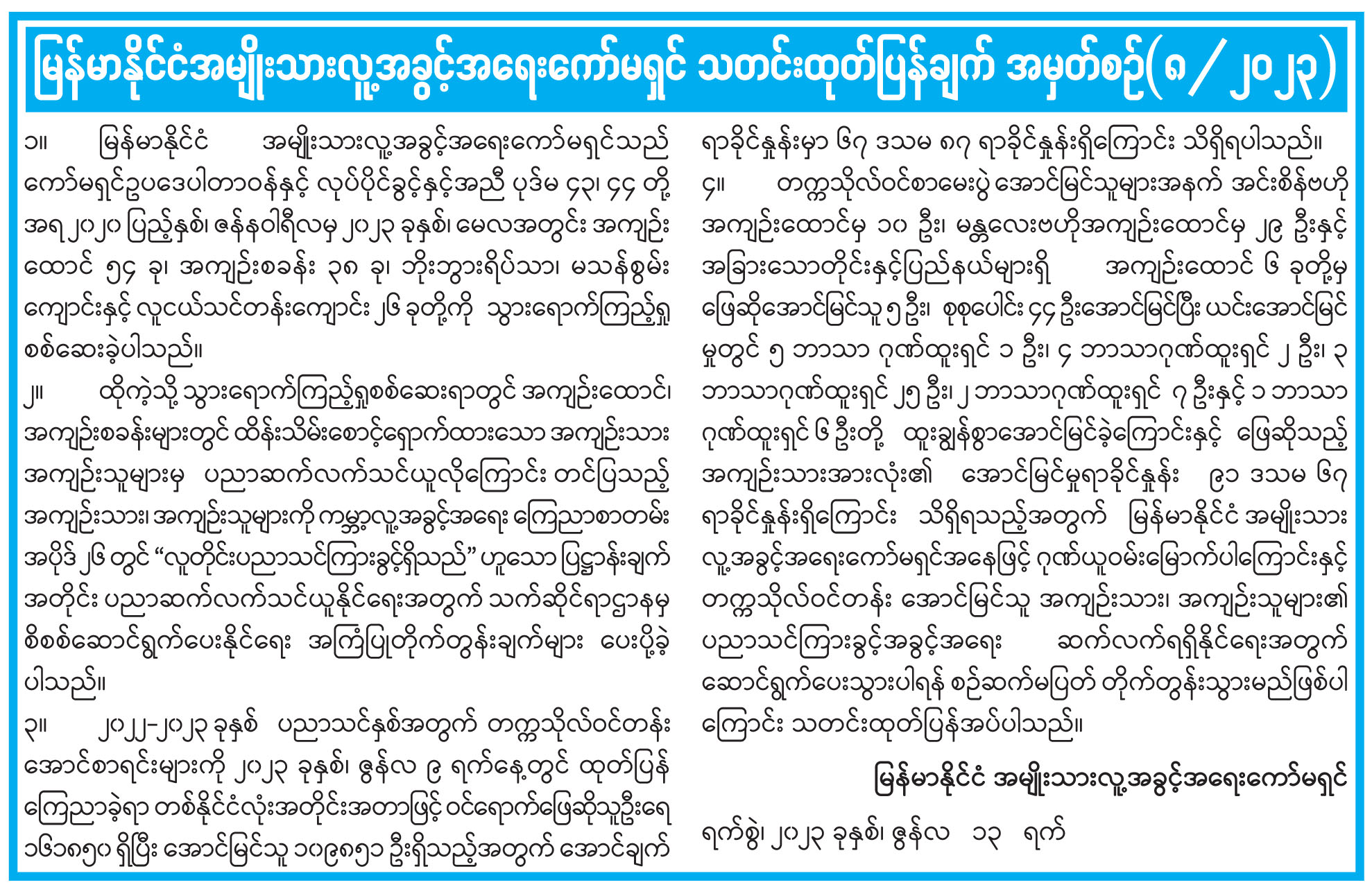 မြန်မာနိုင်ငံအမျိုးသားလူ့အခွင့်အရေးကော်မရှင် သတင်းထုတ်ပြန်ချက် အမှတ်စဉ်(၈/၂၀၂၃)