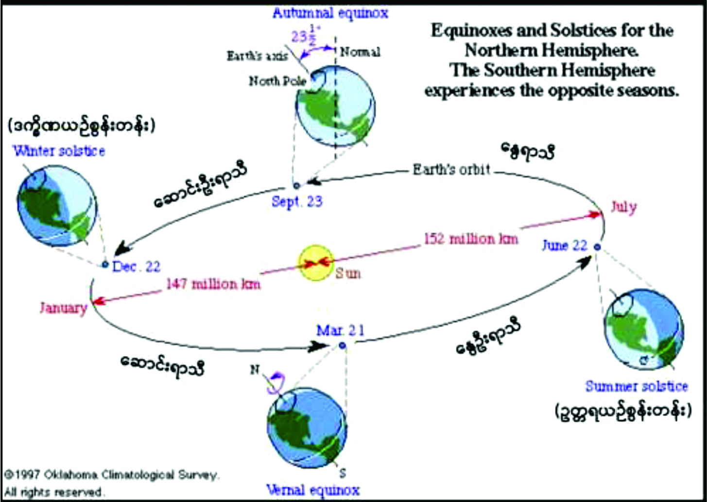 စကြဝဠာအဖွဲ့အစည်းတွင် ပါဝင်သော နေအဖွဲ့အစည်း(Solar System)အတွင်း ကမ္ဘာအပါအဝင် ဂြိုဟ်များနှင့် ဂြိုဟ်ရံလတို့သည် နေကိုပတ်လမ်းတစ်ခုစီဖြင့် လှည့်ပတ်လျက်ရှိပြီး ကမ္ဘာသည် နေကိုဗဟိုပြု၍ ဘဲဥပုံလမ်းကြောင်း အတိုင်း ၂၃.၅ ဒီဂရီ တိမ်းစောင်းကာ လှည့်ပတ်လျက်ရှိပါသည်။ ထို့ကြောင့် နေပတ်လမ်းကြောင်းသည် အီကွေတာမျဉ်းပေါ်သို့ တစ်နှစ်လျှင် နှစ်ကြိမ်ရောက်ရှိပြီး ကမ္ဘာတိမ်းစောင်းရာ ၂၃.၅ ဒီဂရီ အမှတ်နေရာ နှစ်ခုပေါ်သို့ တစ်နှစ်လျှင် နှစ်ကြိမ် ရောက်ရှိပါသည်။