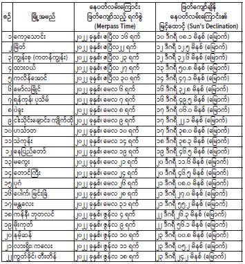 နေ၏ မြင့်ထောင့်(Sun Declination)ကို နှစ်အလိုက်ထုတ်ဝေသော ရေကြောင်းဆိုင်ရာ နက္ခတ်တာရာပြက္ခဒိန်(Nautical Almanac)ရှိ ဇယားများတွင် လအလိုက်၊ နေ့ရက်အလိုက် ကြည့်ရှုကာ တွက်ချက်နိုင်ပါသည်။ ၂၀၂၂ ခုနှစ် ဧပြီလ ၁၆ ရက်မှ သြဂုတ်လ ၂၇ ရက်အတွင်း ဖော်ပြပါ ဇယားအတိုင်း မြန်မာနိုင်ငံရှိ မြို့များအပေါ်သို့ ဖြတ်သန်းလျက်ရှိပါသည်။ နေသည် နေပတ်လမ်းအတိုင်း ကော့သောင်းမြို့အပေါ်သို့ ဧပြီလ ၁၆ ရက်တွင် စတင်ဖြတ်သန်းခဲ့ပြီး နောက်ပိုင်းမှစ၍ နွေအကုန် မိုးအကူးကာလကို ကူးပြောင်းခဲ့ပါသည်။