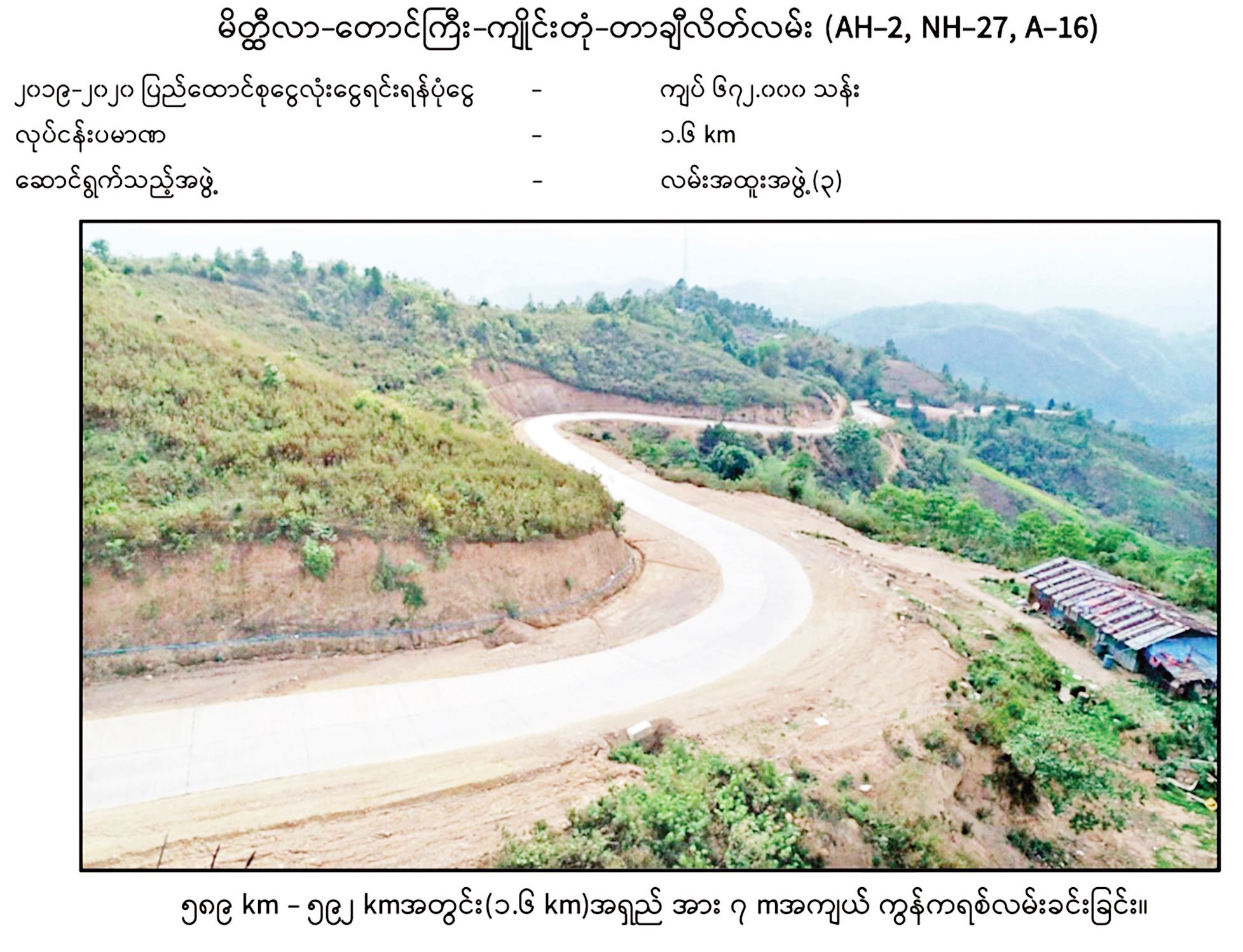 မန္တလေးတိုင်းဒေသကြီး မိတ္ထီလာ မြို့နယ်မှစ၍ ရှမ်းပြည်နယ်(တောင်ပိုင်း) တောင်ကြီးမြို့၊ ရှမ်းပြည်နယ်(အရှေ့ပိုင်း) ကျိုင်းတုံမြို့နှင့် တာချီလိတ်မြို့တို့ကို ဆက်သွယ်ထားသော မိတ္ထီလာ- တောင်ကြီး- ကျိုင်းတုံ- တာချီလိတ် လမ်းသည် အာရှလမ်းမကြီးအမှတ်(၂) (AH-2) ဖြစ်ပြီး လမ်းအရှည် ၄၉၁ မိုင် ရှိပါ သည်။ မိတ္ထီလာ-တောင်ကြီး- ကျိုင်းတုံ- တာချီလိတ်လမ်း အဆင့်မြှင့်တင်ခြင်း လုပ်ငန်းများဆောင်ရွက်ရာတွင် တောင်ပေါ် ဒေသလမ်းကုမ္ပဏီက BOT စနစ်ဖြင့် ဆောင်ရွက်လျက်ရှိရာ မန္တလေးတိုင်း ဒေသကြီးအတွင်းရှိ လမ်းမိုင် ၅၂/၆ တွင် ၄၈ ပေအကျယ် ကတ္တရာလမ်းအဖြစ် ၂၆ မိုင် ၁ ဖာလုံ ဆောင်ရွက်ပြီး ဖြစ်သည်။