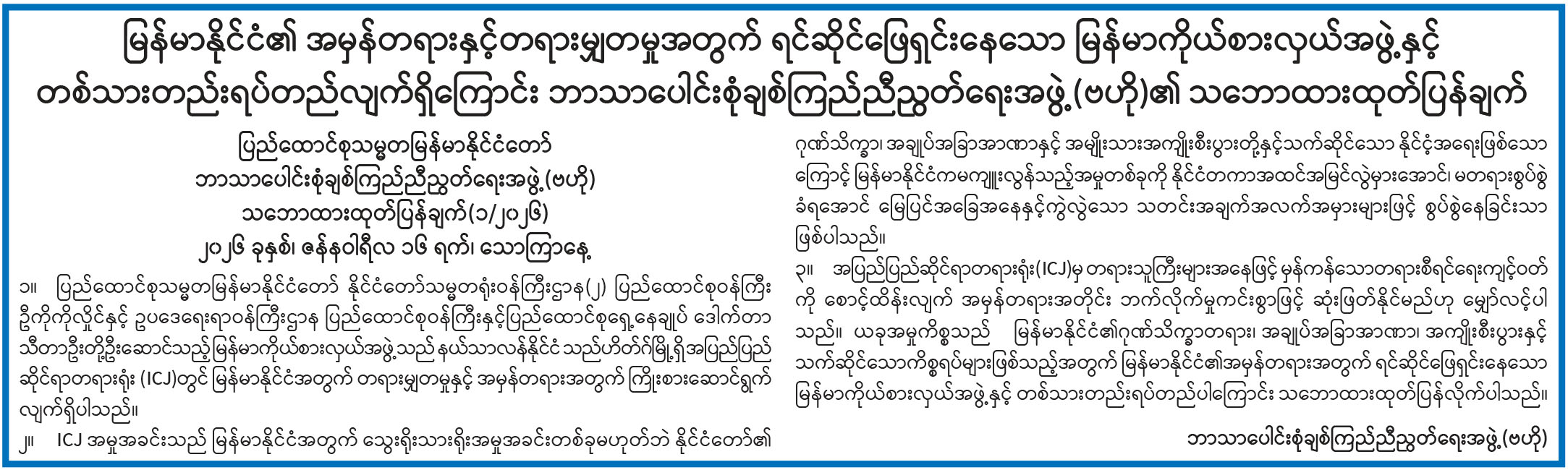 မြန်မာနိုင်ငံ၏ အမှန်တရားနှင့်တရားမျှတမှုအတွက် ရင်ဆိုင်ဖြေရှင်းနေသော မြန်မာကိုယ်စားလှယ်အဖွဲ့နှင့် တစ်သားတည်းရပ်တည်လျက်ရှိကြောင်း ဘာသာပေါင်းစုံချစ်ကြည်ညီညွတ်ရေးအဖွဲ့(ဗဟို)၏ သဘောထားထုတ်ပြန်ချက်