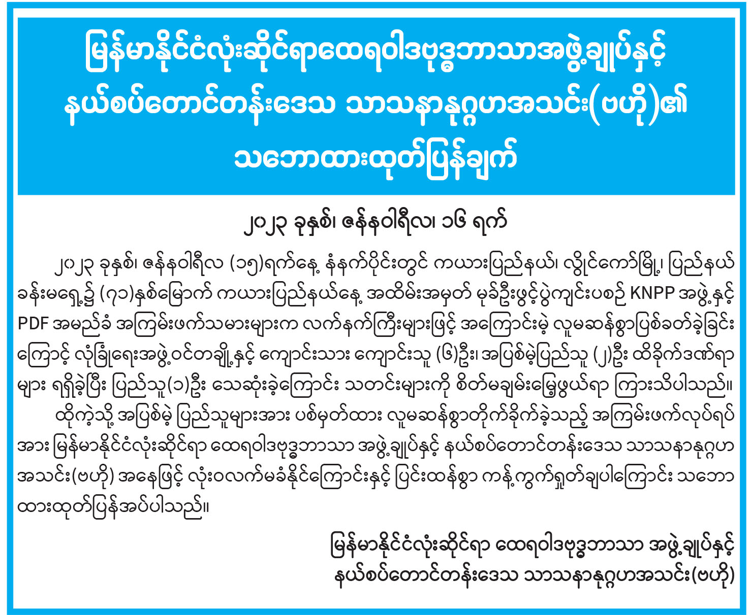 မြန်မာနိုင်ငံလုံးဆိုင်ရာ ထေရဝါဒဗုဒ္ဓဘာသာအဖွဲ့ချုပ်နှင့် နယ်စပ်တောင်တန်းဒေသ သာသနာနုဂ္ဂဟအသင်း(ဗဟို)၏ သဘောထားထုတ်ပြန်ချက်