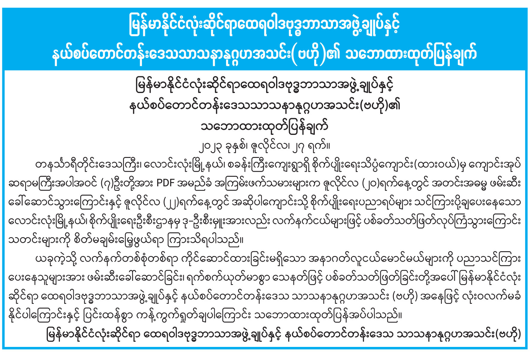 မြန်မာနိုင်ငံလုံးဆိုင်ရာထေရဝါဒဗုဒ္ဓဘာသာအဖွဲ့ချုပ်နှင့် နယ်စပ်တောင်တန်းဒေသသာသနာနုဂ္ဂအသင်း(ဗဟို)၏ သဘောထားထုတ်ပြန်ချက်
