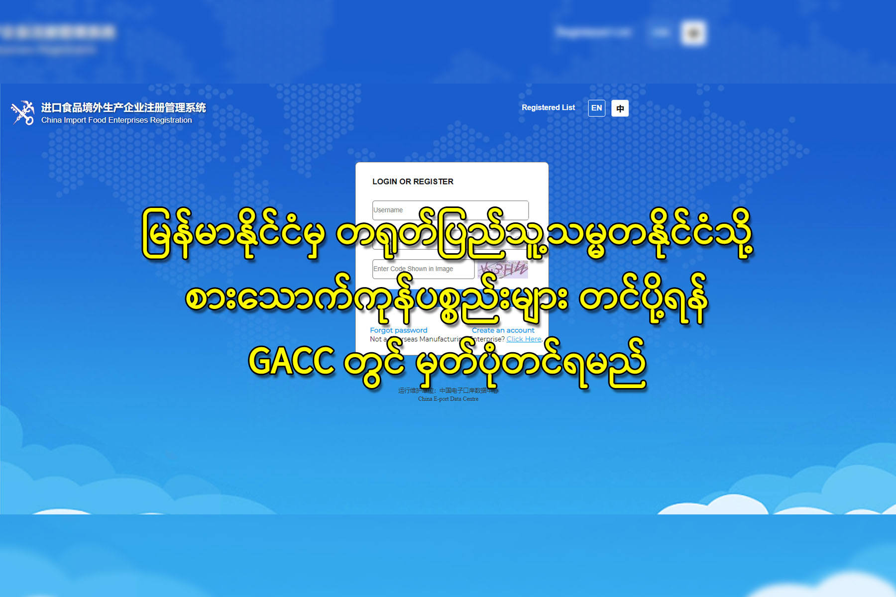 တရုတ်ပြည်သူ့သမ္မတနိုင်ငံ အကောက်ခွန် အထွေထွေအုပ်ချုပ်မှု အာဏာပိုင်အဖွဲ့ (General Administration of Customs of China - GACC) ၏ ကြေညာချက်အမှတ် (၂၄၈) နှင့် (၂၄၉) တို့အရ ၂၀၂၂ ခုနှစ် ဇန်နဝါရီ ၁ ရက်မှ စတင်၍ မြန်မာနိုင်ငံမှ တရုတ်နိုင်ငံသို့ စားသောက်ကုန်တင်ပို့မည့်/ တင်ပို့လျက်ရှိသည့် လုပ်ငန်းရှင်များ အနေဖြင့် GACC တွင် မှတ်ပုံတင်ပြီးမှသာလျှင် တင်ပို့ခွင့်ရရှိမည် ဖြစ်သည်။