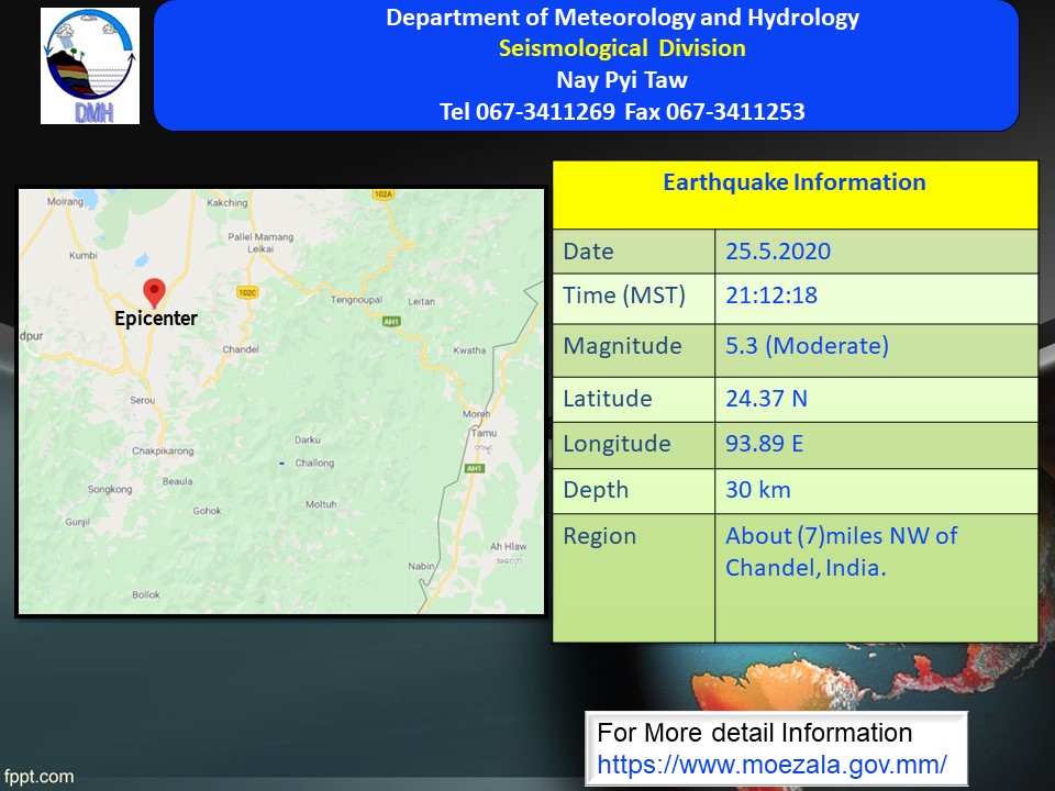 ယနေ့ည ၉ နာရီ ၁၂ မိနစ် တွင် တမူးမြေငလျင်စခန်းမှ အနောက် - အနောက်မြောက်ဘက် ၂၉ မိုင် ခန့်ကွာဝေးသော၊ မြန်မာနိုင်ငံပြည်ပ အိန္ဒိယနိုင်ငံ၊ ချန်ဒဲမြို့၏ အနောက်မြောက်ဘက် ၇ မိုင်ခန့်အကွာတွင် အင်အားရစ် (ခ်) တာစကေး ၅ ဒသမ ၃ အဆင့်ရှိ အင်အားအသင့်အတင့်ရှိသော မြေငလျင်တစ်ခု လှုပ်ရှားသွားကြောင်း သိရသည်။