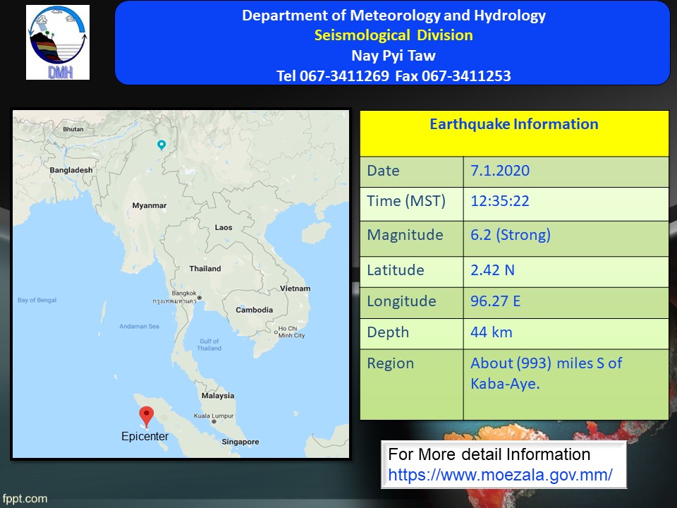 ၂၀၂၀ ခုနှစ်၊ ဇန်နဝါရီလ(၇)ရက်နေ့၊ မြန်မာစံတော်ချိန် (၁၂)နာရီ၊ (၃၅)မိနစ်၊ (၂၂) စက္ကန့် အချိန်တွင် ကမ္ဘာအေးမြေငလျင်စခန်းမှ တောင်ဘက် (၉၉၃)မိုင်ခန့် ကွာဝေးသော မြန်မာနိုင်ငံပြည်ပ (Northern Sumatra, Indonesia)၊ မြောက်လတ္တီတွဒ် (၂.၄၂) ဒီဂရီ၊ အရှေ့လောင်ဂျီတွဒ် (၉၆.၂၇) ဒီဂရီ၊ အနက် (၄၄)ကီလိုမီတာကို ဗဟိုပြု၍ အင်အားရစ်(ခ်)တာစကေး (၆.၂)အဆင့်ရှိ အင်အားပြင်းထန်သော မြေငလျင်တစ်ခု လှုပ်ရှားသွားကြောင်း မိုးလေဝသနှင့်ဇလဗေဒညွှန်ကြားမှုဦးစီးဌာနမှ သိရသည်။