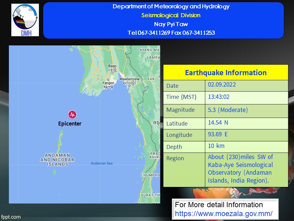 ၂၀၂၂ ခုနှစ်၊ စက်တင်ဘာလ (၂)ရက်နေ့၊ မြန်မာစံတော်ချိန် (၁၃)နာရီ၊ (၄၃)မိနစ်၊ (၀၂) စက္ကန့်အချိန်တွင် ကမ္ဘာအေးမြေငလျင်စခန်းမှ အနောက်တောင်ဘက် (၂၃၀)မိုင် ခန့်ကွာဝေးသော မြန်မာနိုင်ငံပြည်ပ (Andaman Islands, India Region )၊ မြောက်လတ္တီတွဒ် (၁၄.၅၄)ဒီဂရီ၊ အရှေ့လောင်ဂျီတွဒ် (၉၃.၆၉)ဒီဂရီ၊ အနက် (၁၀)ကီလိုမီတာကို ဗဟိုပြု၍ အင်အားရစ်(ခ်)တာ စကေး (၅.၃) အဆင့်ရှိ အင်အားအသင့်အတင့်ရှိသော မြေငလျင်တစ်ခု လှုပ်ရှားသွားကြောင်း တိုင်းထွာရရှိပါသည်။