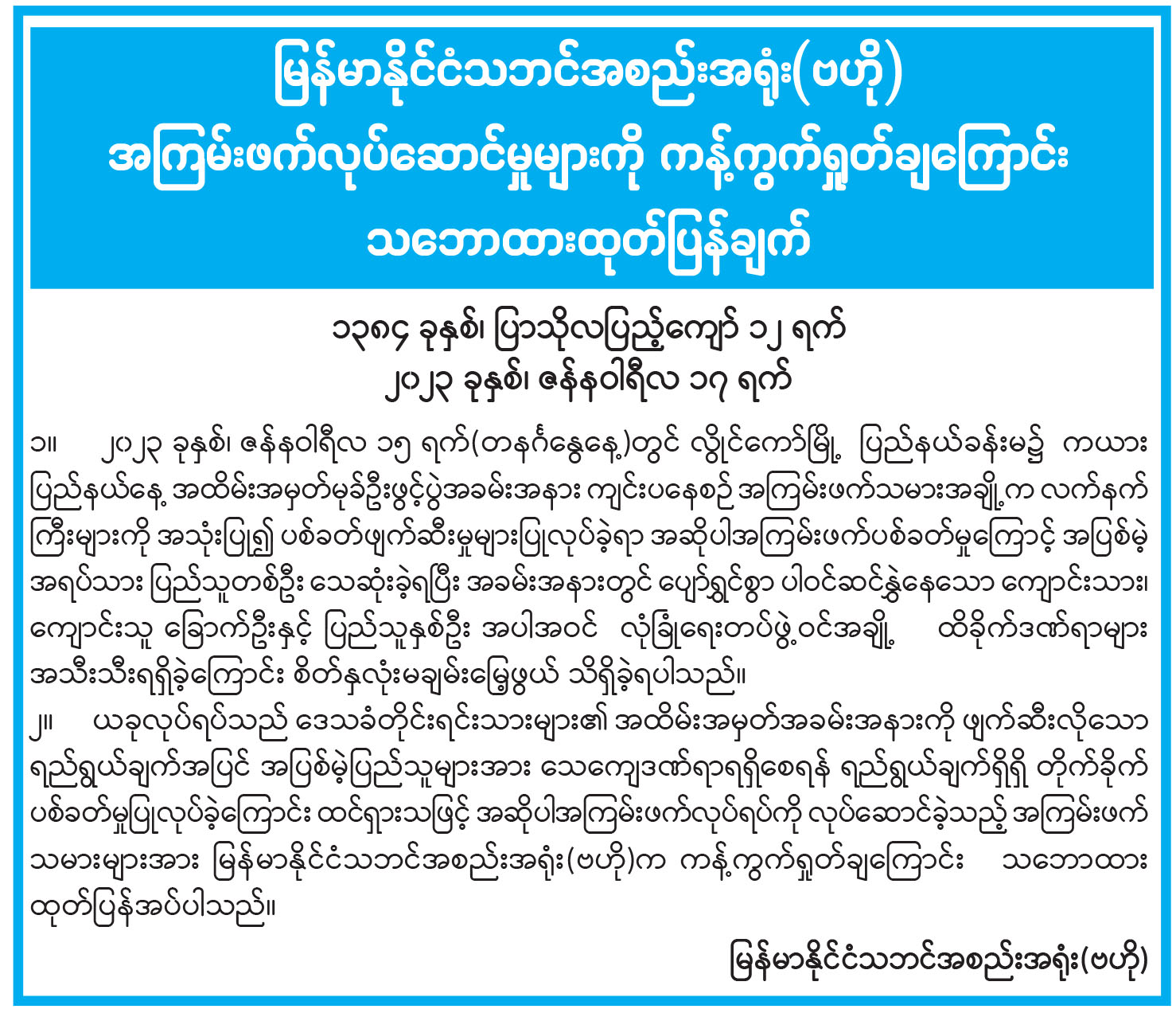 မြန်မာနိုင်ငံသဘင်အစည်းအရုံး(ဗဟို) အကြမ်းဖက်လုပ်ဆောင်မှုများကို ကန့်ကွက်ရှုတ်ချကြောင်း သဘောထားထုတ်ပြန်ချက်
