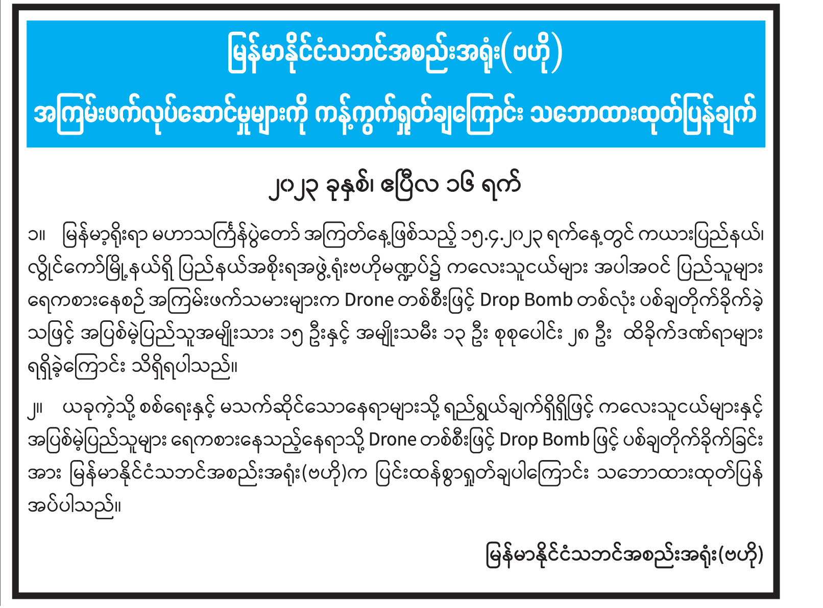 မြန်မာနိုင်ငံသဘင်အစည်းအရုံး(ဗဟို) အကြမ်းဖက်လုပ်ဆောင်မှုများကို ကန့်ကွက်ရှုတ်ချကြောင်း သဘောထားထုတ်ပြန်ချက်