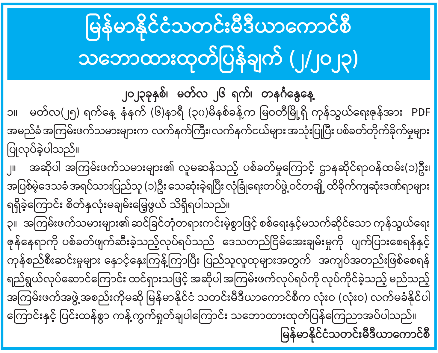 မြန်မာနိုင်ငံသတင်းမီဒီယာကောင်စီ သဘောထားထုတ်ပြန်ချက် (၂/၂၀၂၃)