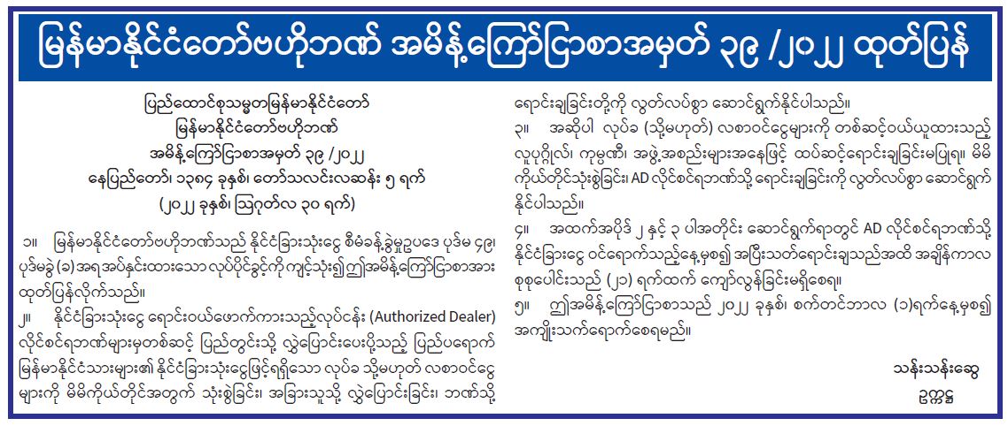 ၃။ အဆိုပါ လုပ်ခ (သို့မဟုတ်) လစာဝင်ငွေများကို တစ်ဆင့်ဝယ်ယူထားသည့် လူပုဂ္ဂိုလ်၊ ကုမ္ပဏီ၊ အဖွဲ့အစည်းများအနေဖြင့် ထပ်ဆင့်ရောင်းချခြင်းမပြုရ။ မိမိ ကိုယ်တိုင်သုံးစွဲခြင်း၊ AD လိုင်စင်ရဘဏ်သို့ ရောင်းချခြင်းကို လွတ်လပ်စွာ ဆောင်ရွက် နိုင်ပါသည်။
