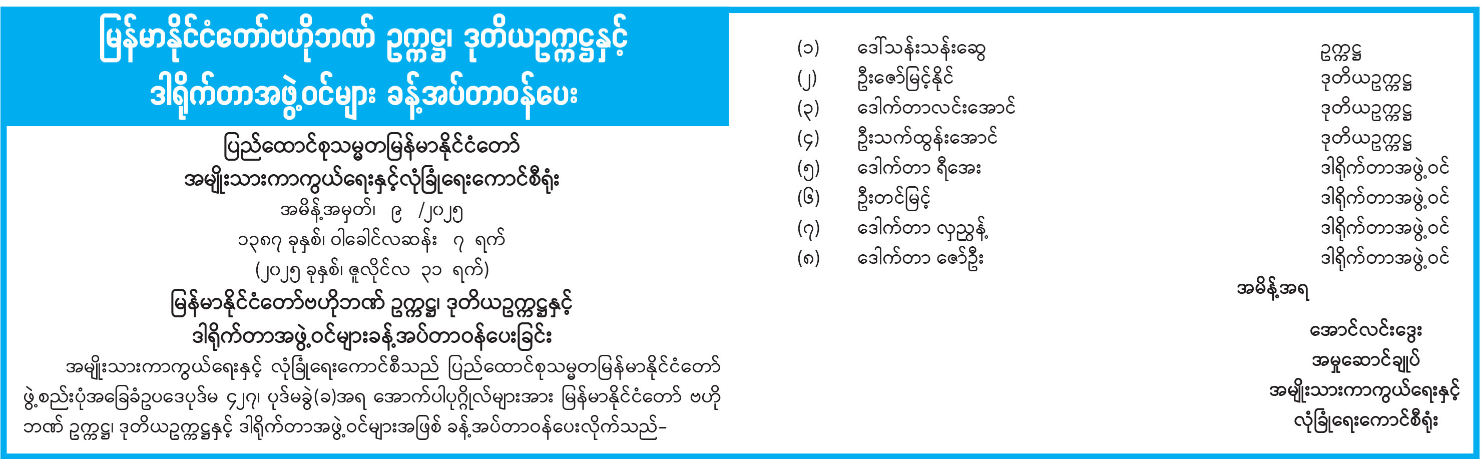 မြန်မာနိုင်ငံတော်ဗဟိုဘဏ် ဥက္ကဋ္ဌ၊ ဒုတိယဥက္ကဋ္ဌနှင့် ဒါရိုက်တာအဖွဲ့ဝင်များ ခန့်အပ်တာဝန်ပေး