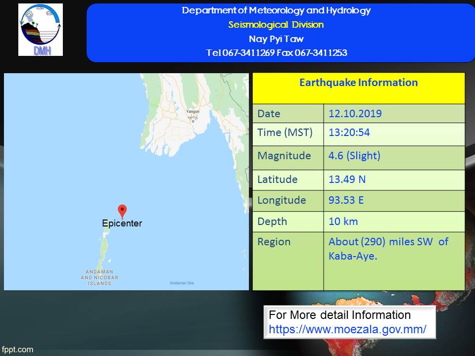 ယနေ့ မွန်းလွဲ ၁ နာရီ မိနစ် ၂၀ ခန့်က ကမ္ဘာအေးမြေငလျင်စခန်းမှ အနောက်တောင်ဘက် မိုင် (၂၉၀) ခန့်ကွာဝေးသော မြန်မာနိုင်ငံပြည်ပ Andaman ကျွန်းစုအနီးကို ဗဟိုပြုပြီး အင်အားရစ်(ခ)တာစကေး (၄.၆)အဆင့်ရှိ အင်အားအနည်းငယ်ရှိသော မြေငလျင်တစ်ခု လှုပ်ရှားသွားကြောင်း မိုးလေဝသနှင့် ဇလဗေဒညွှန်ကြားမှုဦးစီးဌာနမှ ထုတ်ပြန်သည်။