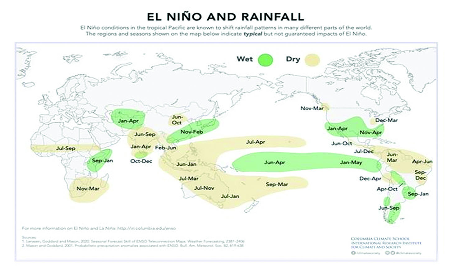 အယ်လ်နီညိုဖြစ်စဉ်များသည် ကမ္ဘာအရပ်ရပ်တွင် ရာသီဥတုနှင့် မိုးလေဝသဖြစ်စဉ်များအပေါ် သက်ရောက်လေ့ရှိပါသည်။ အထူးသဖြင့် အီကွေတာ နှင့်နီးသောဒေသများတွင် ပိုမိုခံစားရလေ့ရှိပါသည်။ ဥပမာအားဖြင့် ပုံ(၄)တွင် ဖော်ပြထားသည့်အတိုင်း အယ်လ်နီညို၏ အကျိုးသက်ရောက်မှုကြောင့် တောင်အာဖရိကတိုက် အရှေ့ဘက်ကမ်းခြေတွင် မိုးခေါင်ရေရှားမှုဖြစ်စဉ်များ၊ အာရှတိုက်တောင်ပိုင်းတွင် မုတ်သုံရာသီလေကို အင်အားနည်းစေခြင်းများ၊ ပူပြင်းခြောက်သွေ့ခြင်းများကို ကြုံတွေ့ရလေ့ရှိပါသည်။