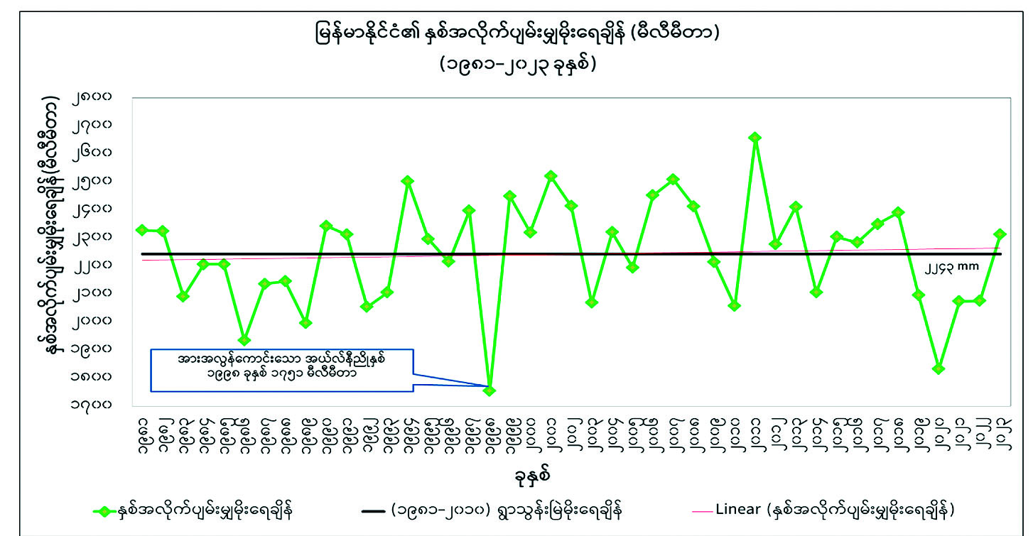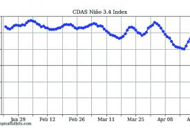 ၂၀၂၃ ခုနှစ် ဧပြီလမှ စတင်ခဲ့သော အယ်လ်နီညို ဖြစ်စဉ်သည် ၂၀၂၃ ခုနှစ် မေလ၊ ဇွန်လနှင့် ဇူလိုင်လ တို့တွင် အားအနည်းငယ်ရှိသော အယ်လ်နီညို အခြေအနေသို့လည်းကောင်း၊ ဩဂုတ်လ၊ စက်တင်ဘာလနှင့် အောက်တိုဘာလတို့တွင် အားအသင့်အတင့်ရှိသော အယ်လ်နီညိုအခြေအနေသို့လည်းကောင်း၊ နိုဝင်ဘာလ၊ ဒီဇင်ဘာလနှင့် ဇန်နဝါရီလ များတွင် အားကောင်းသော အယ်လ်နီညိုအခြေအနေသို့လည်းကောင်း အသီးသီးရောက်ရှိခဲ့ပြီး ဖေဖော်ဝါရီလနှင့် မတ်လမှစတင်ကာ အားအသင့်အတင့်ရှိသော အယ်လ်နီညိုအဆင့်သို့ ပြန်လည် လျော့ကျခဲ့ရာ ယခု ဧပြီလ ၂၂ ရက်နေ့တွင် ပုံ(၈) တွင် ဖော်ပြထားသည့်အတိုင်း ပျမ်းမျှပင်လယ်ရေမျက်နှာပြင်အပူချိန်အထက် (+၀.၇၇၃ ဒီဂရီ ဆဲလ်စီးယပ်) ဖြင့် အားအနည်းငယ်ရှိသော အယ်လ်နီညိုအခြေအနေ၌ ဆက်လက်တည်ရှိနေပါသည်။ နိုင်ငံတကာမိုးလေဝသဌာနများ၏ သင်္ချာပုံစံပြုမော်ဒယ်များ ခန့်မှန်းချက်အရ ၂၀၂၄ ခုနှစ် ဇွန်လတွင် ပုံမှန်အခြေအနေသို့ ပြန်လည်ရောက်ရှိနိုင်ပြီး ၂၀၂၄ ခုနှစ် နှစ်ကုန်ပိုင်းတွင် လာနီညာအခြေအနေသို့ ကူးပြောင်းရောက်ရှိနိုင်သည်ဟု ခန့်မှန်းရပါသည်။ ကမ္ဘာ့မိုးလေဝသအဖွဲ့ချုပ်၏ ထုတ်ပြန်ချက်များအရ မြန်မာနိုင်ငံသည် ၂၀၂၄ ခုနှစ် ဖေဖော်ဝါရီလမှ ဇွန်လအထိ မိုးရွာသွန်းမှုလျော့နည်းနိုင်ပြီး ခြောက်သွေ့သော အခြေအနေတွင် ရှိနိုင်ပါသည်။