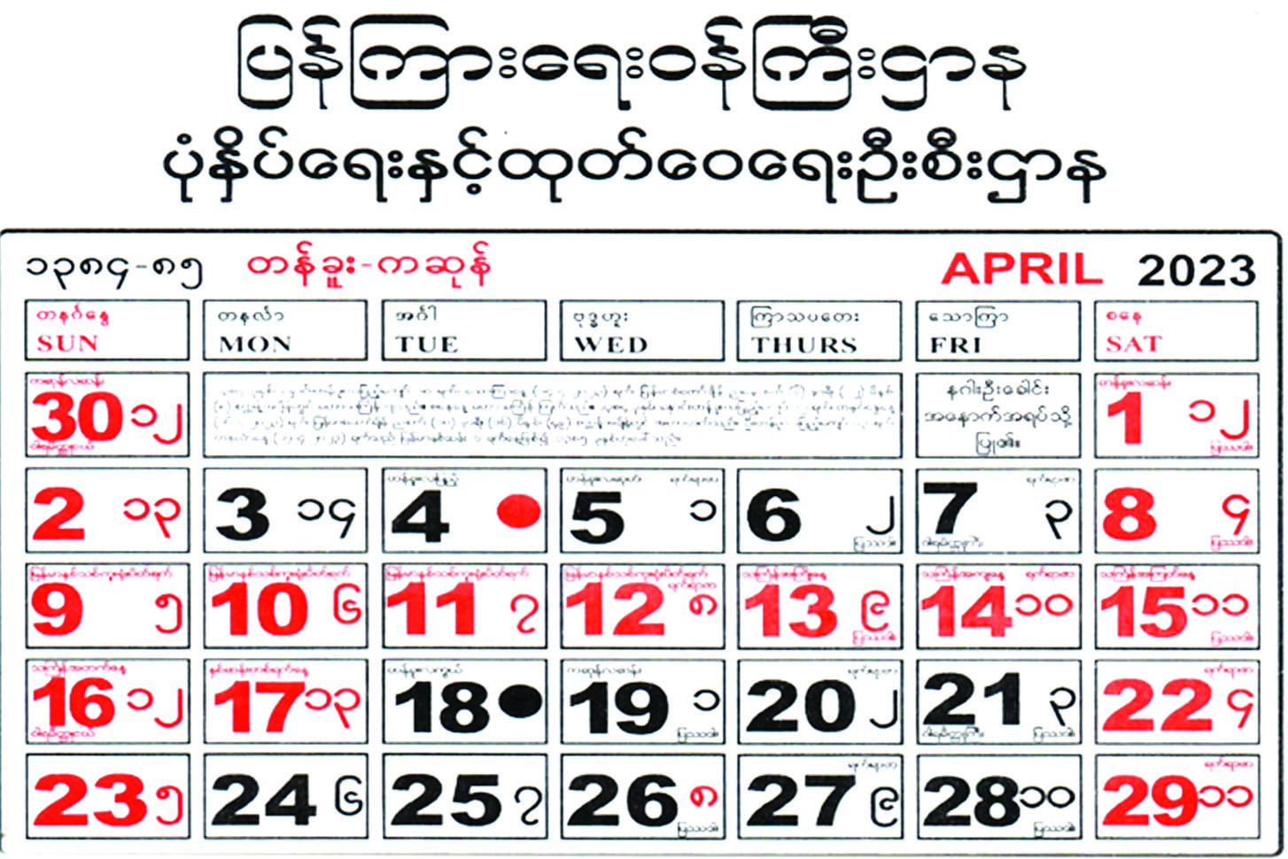 မြန်မာပြက္ခဒိန်တွင် နှောင်းတန်ခူး လဆန်း ၁၂ ရက် (စနေ)နေ့မှ ကဆုန် လဆန်း ၁၂ ရက် (တနင်္ဂနွေ) နေ့အထိ ပြသည်။ အင်္ဂလိပ်ပြက္ခဒိန်၌ ဧပြီ ၁ ရက် (စနေ)နေ့မှ ၃၀ ရက် (တနင်္ဂနွေ) တို့ ယှဉ်တွဲဖော်ပြထားသည်။ မြန်မာ့အထိမ်း အမှတ် နေ့ကြီးရက်ကြီးများ၊ ရုံးပိတ်ရက်များ၊ ရက်ရာဇာ၊ ပြဿဒါး၊ နဂါးခေါင်းလှည့်နှင့် ဝါရမိတ္တုရက်၊ သင်္ကြန်အခါ တော်ရက်များကိုပါ ပြဆိုထားသည်။ နှစ်ဆန်း ၁ ရက်နေ့မှာ သင်္ကြန်အတက် နေ့နောက်နေ့ကို ယူထားပြီး ဦးတန်ခူး လပြည့်ကျော် ၁၃ ရက်ဟု သတ်မှတ် ကာ နှစ်ဆန်း ၁ ရက်နေ့ဟု ခေါ်ဝေါ်၍ ၁၃၈၅ ခုနှစ်ဟု သတ်မှတ်သည်။