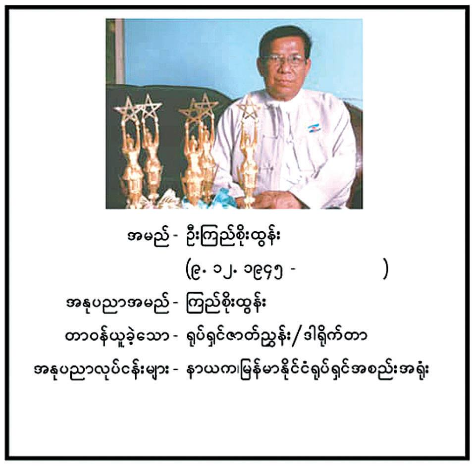 ကြည်စိုးထွန်း ။ ။ မင်းဘူးမှာ အဖေရှိတာ ကိုးနော်။ အဖေက အဲဒီမှာ ရာဇဝတ်ဝန်ထောက်လား ဆရာ။