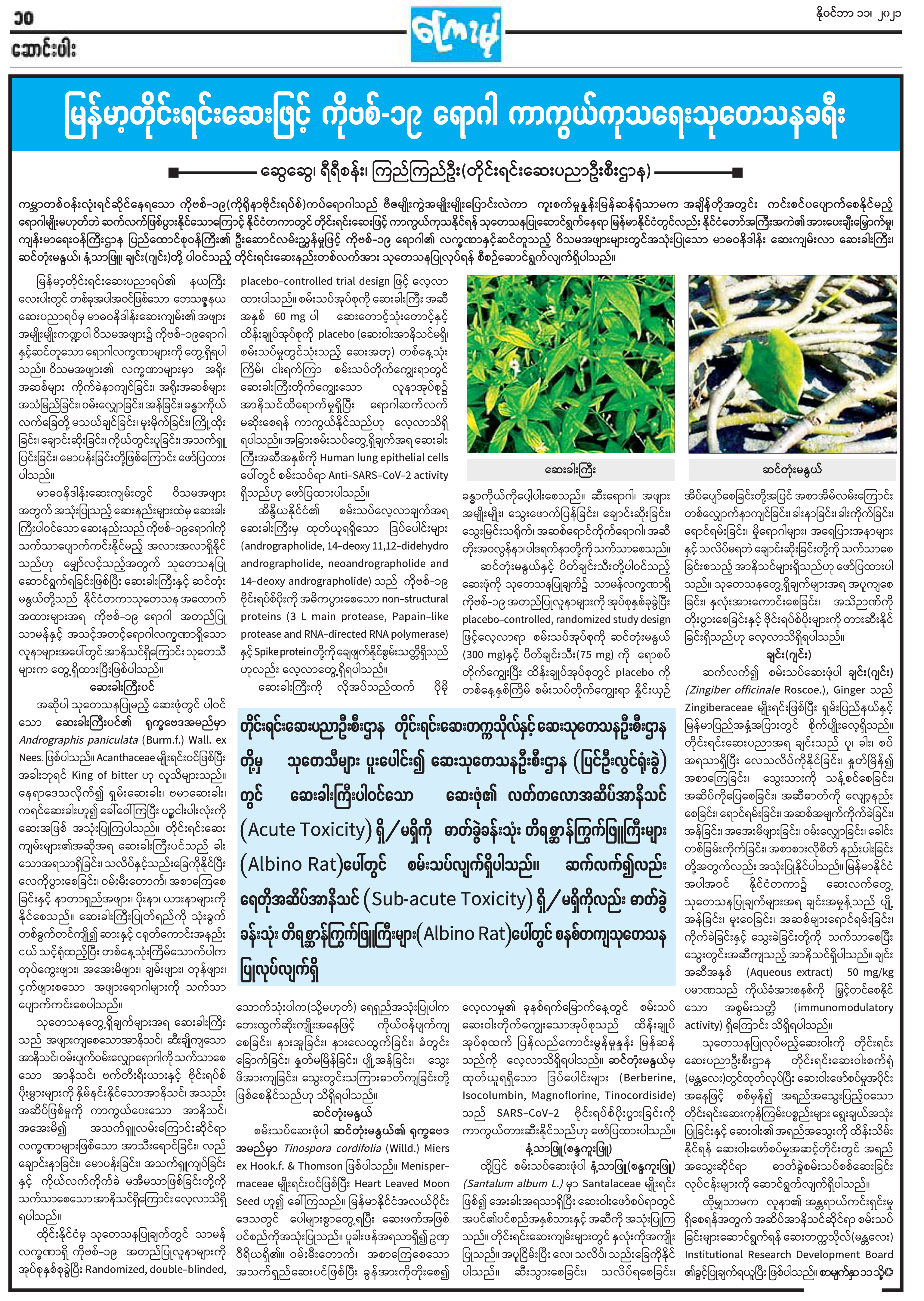 မြန်မာ့တိုင်းရင်းဆေးဖြင့် ကိုဗစ်-၁၉ ရောဂါ ကာကွယ်ကုသရေး သုတေသနခရီး