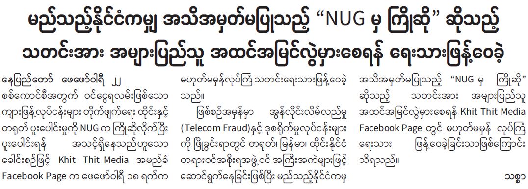 မည်သည့်နိုင်ငံကမျှ အသိအမှတ်မပြုသည့် “NUG မှ ကြိုဆို” ဆိုသည့် သတင်းအား အများပြည်သူ အထင်အမြင်လွဲမှားစေရန် ရေးသားဖြန့်ဝေခဲ့