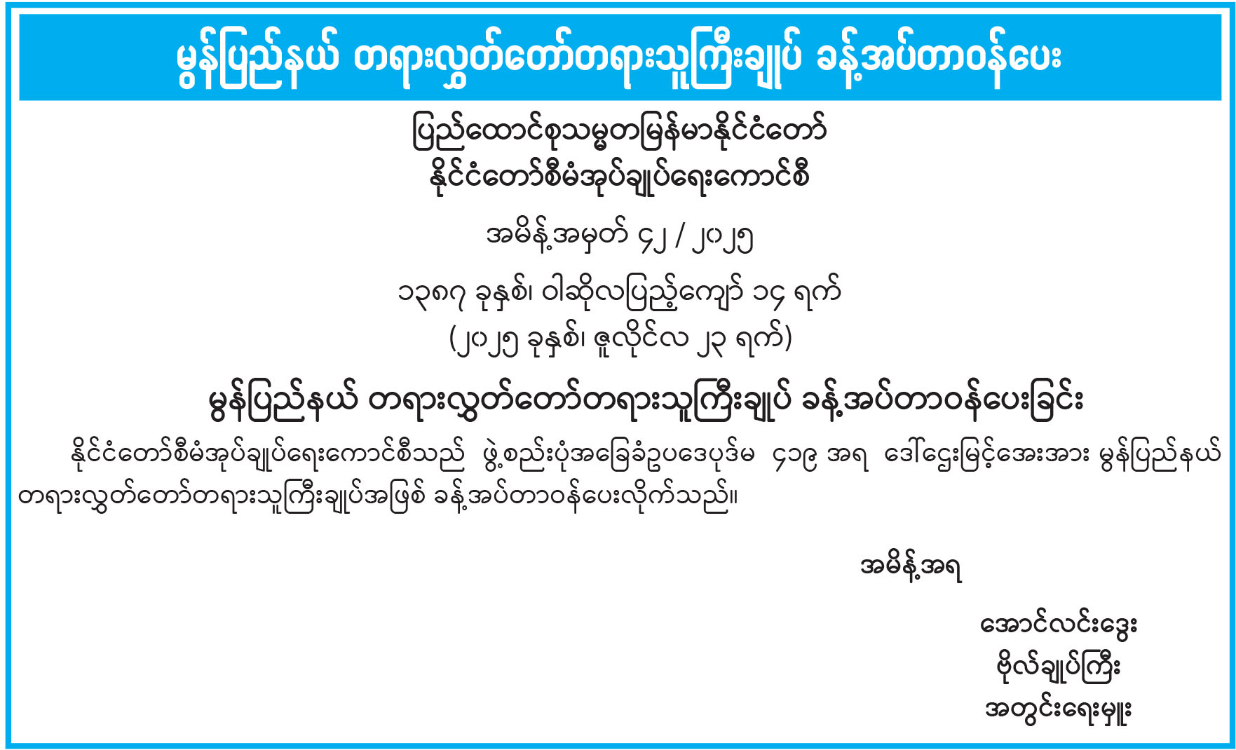 မွန်ပြည်နယ် တရားလွှတ်တော်တရားသူကြီးချုပ် ခန့်အပ်တာဝန်ပေး
