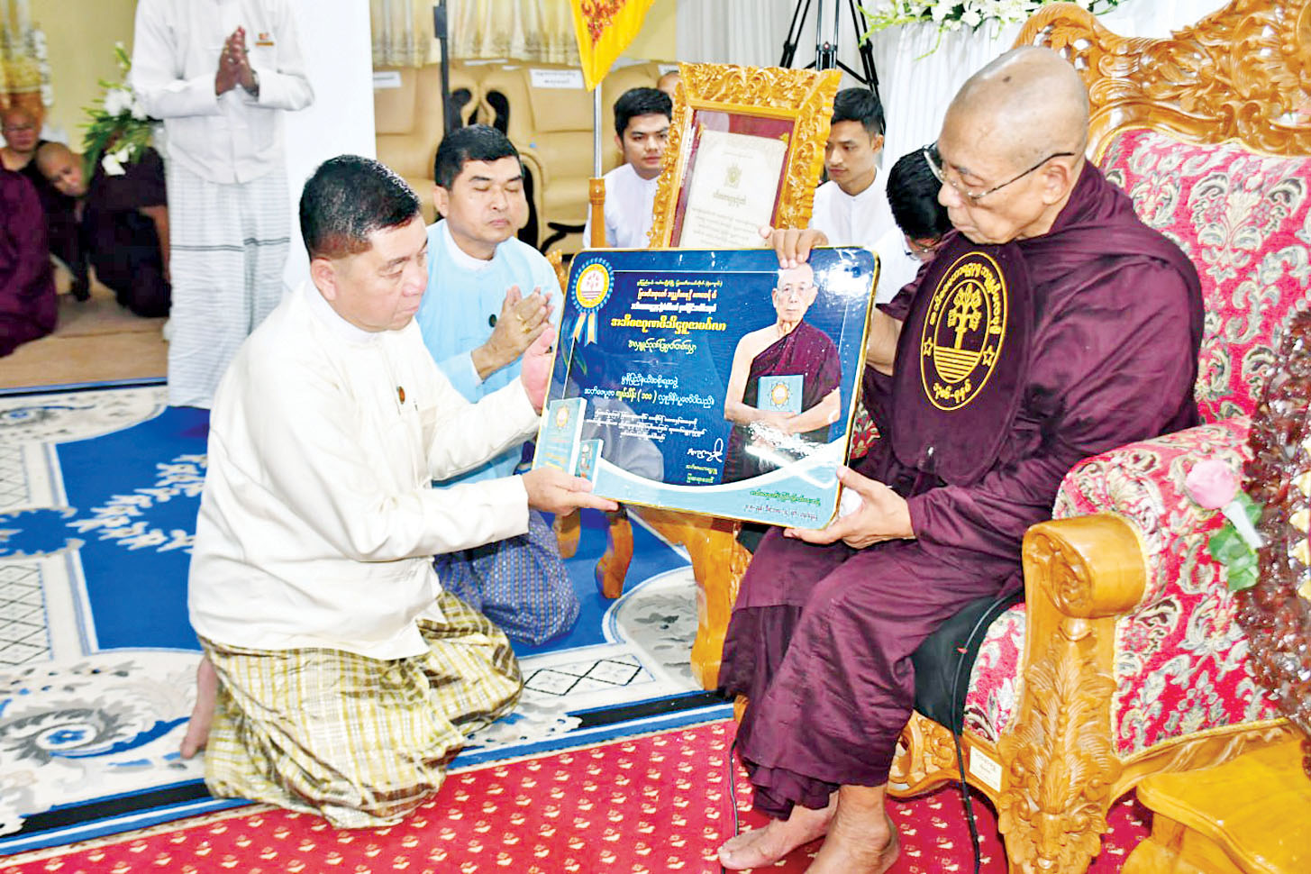 ထို့နောက် ပြည်နယ်ဝန်ကြီးချုပ်က မြဆရာတော်အား အဘိဓဇမဟာရဋ္ဌဂုရုဘွဲ့လက်မှတ်တော်ကို ထပ်ဆင့်ဆက်ကပ်ပြီး အရှေ့တောင်တိုင်းစစ်ဌာနချုပ်တိုင်းမှူးက ဘွဲ့တံဆိပ်တော်နှင့် အလံတော်ကို ထပ်ဆင့်ဆက်ကပ်သည်။