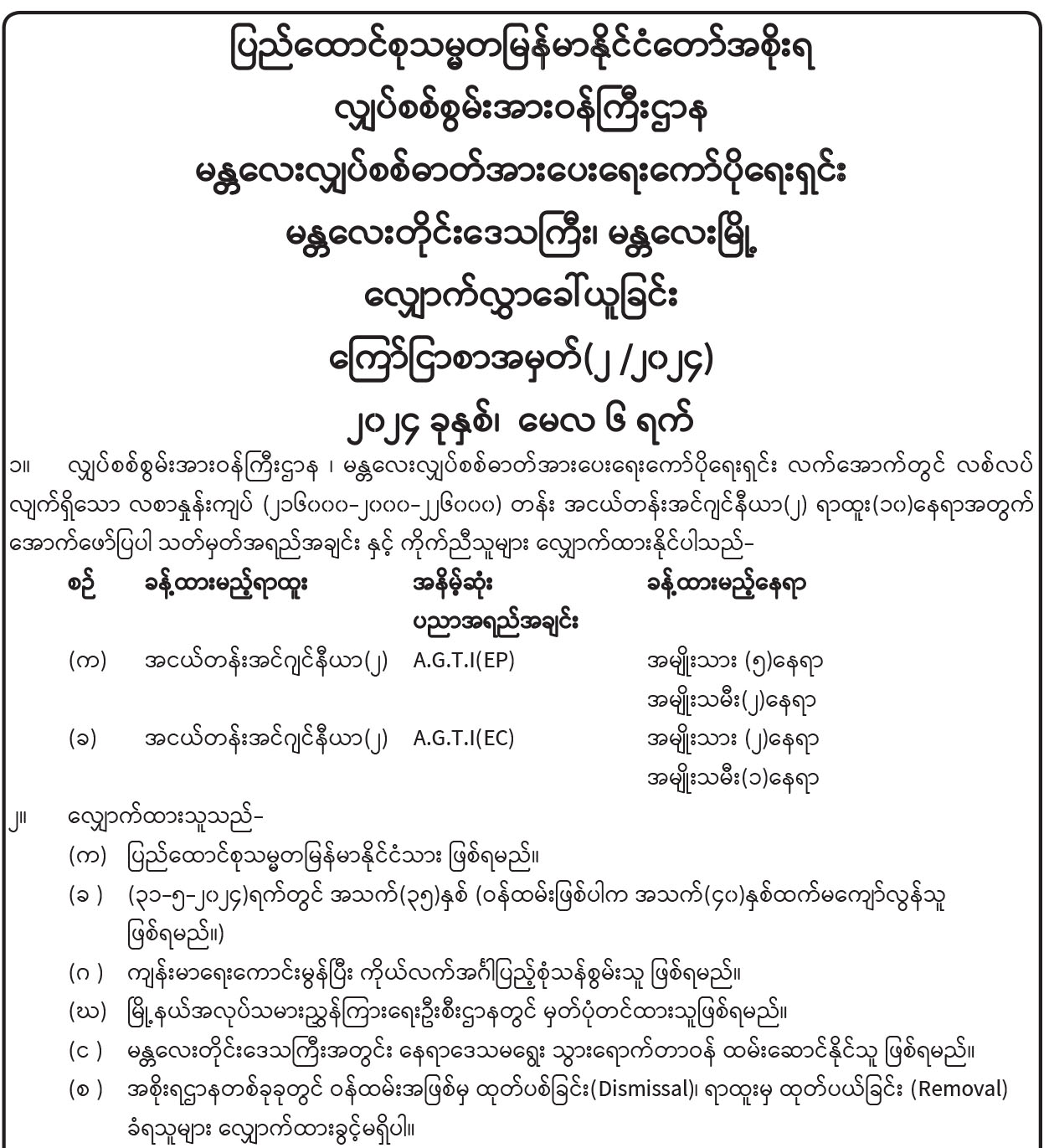 မန္တလေးလျှပ်စစ်ဓာတ်အားပေးရေးကော်ပိုရေးရှင်း၊ မန္တလေးတိုင်းဒေသကြီး၊ မန္တလေးမြို့၊ လျှောက်လွှာခေါ်ယူ