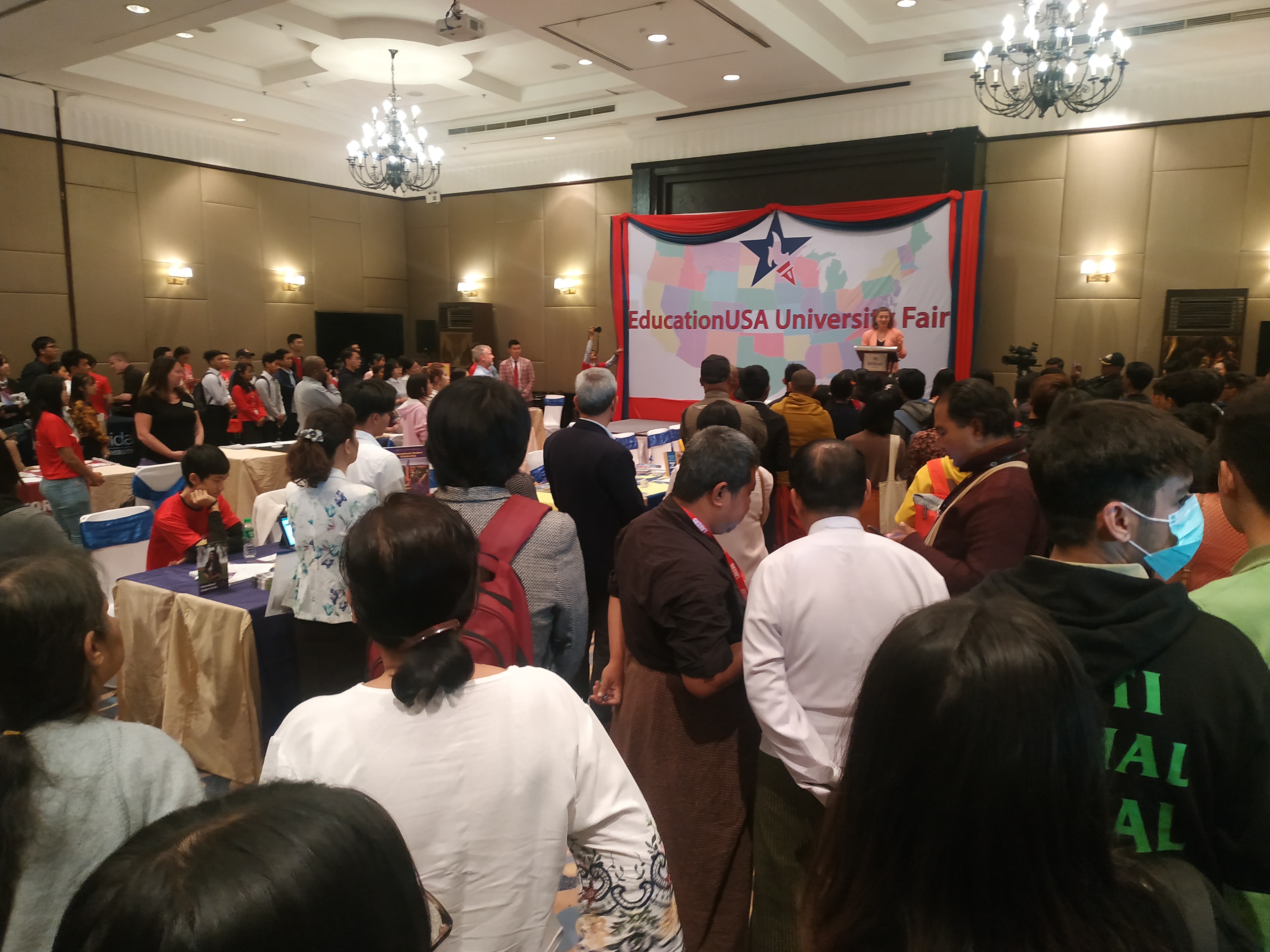 ရှေးဦးစွာ မြန်မာနိုင်ငံဆိုင်ရာ အမေရိကန်သံရုံးမှ ပြည်သူ့ရေးရာအရာရှိ Ms.Deb Lynn က ကြိုဆို နှုတ်ခွန်းဆက်စကားနှင့် ပြပွဲကျင်းပပြုလုပ်ရခြင်းအကြောင်း ရှင်းလင်းပြောကြားပြီး တာဝန်ရှိသူများက U.S. Student Visa ၊ U.S. Exchange Programs များအကြောင်း ရှင်းလင်းပြောကြားသည်။