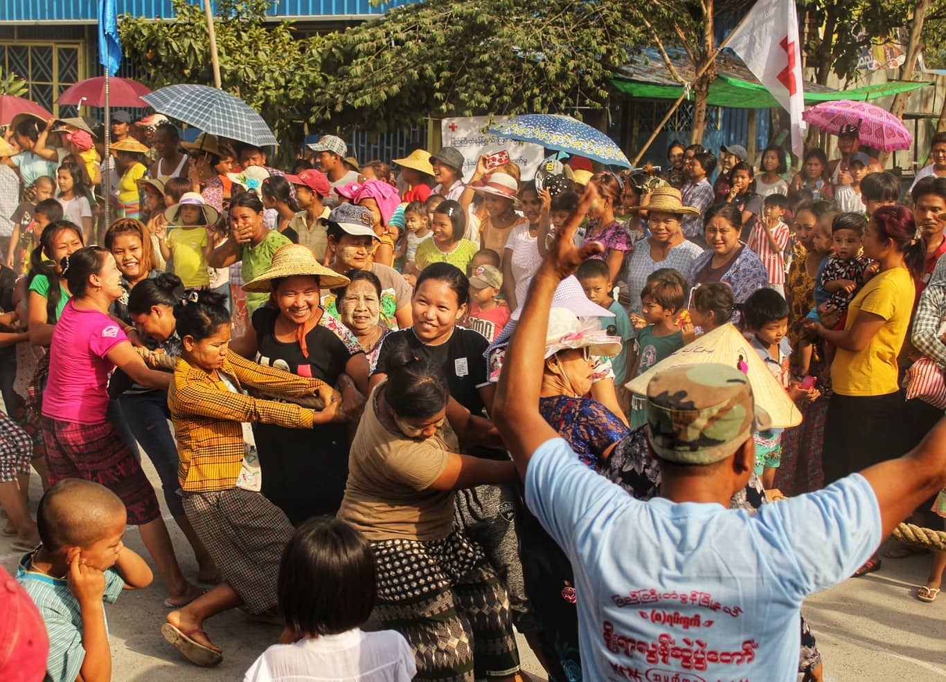 မန္တလေးမြို့၊ ပြည်ကြီးတံခွန်မြို့နယ် ရတနာပုံမြို့သစ် ၅၄ လမ်း၊ ကျန်စစ်သားလမ်းရှိ ရတနာကိုးသွယ် ဓမ္မာရုံရှေ့တွင် မနုးခေါ် မိုးခေါ်လွန်ဆွဲပွဲကို ယနေ့ ညနေပိုင်းက ပြုလုပ်ကြစဉ်။
