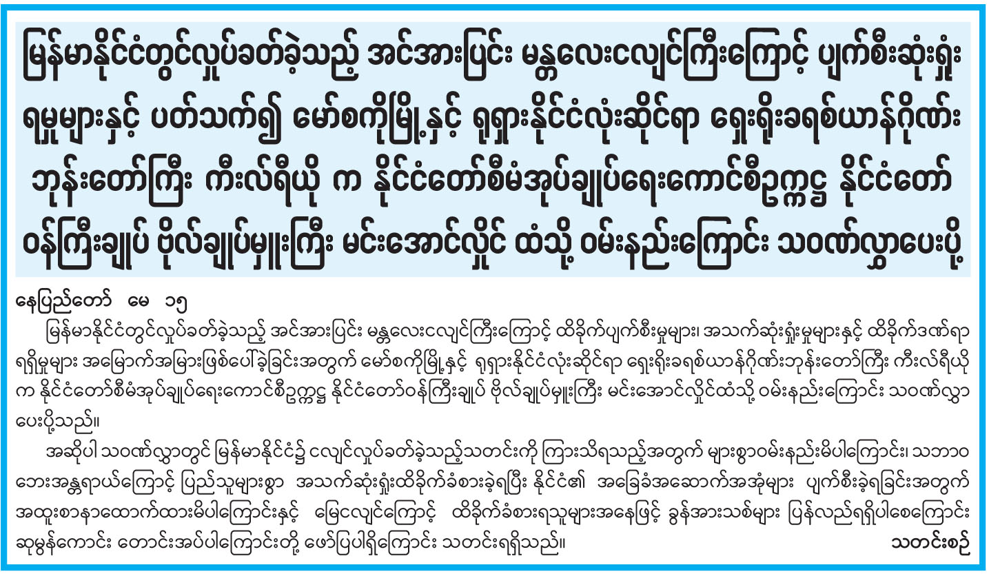 မြန်မာနိုင်ငံတွင်လှုပ်ခတ်ခဲ့သည့် အင်အားပြင်း မန္တလေးငလျင်ကြီးကြောင့် ပျက်စီးဆုံးရှုံးရမှုများနှင့် ပတ်သက်၍ မော်စကိုမြို့နှင့် ရုရှားနိုင်ငံလုံးဆိုင်ရာ ရှေးရိုးခရစ်ယာန်ဂိုဏ်း ဘုန်းတော်ကြီး ကီးလ်ရီယို က နိုင်ငံတော်စီမံအုပ်ချုပ်ရေးကောင်စီဥက္ကဋ္ဌ နိုင်ငံတော် ဝန်ကြီးချုပ် ဗိုလ်ချုပ်မှူးကြီး မင်းအောင်လှိုင် ထံသို့ ဝမ်းနည်းကြောင်း သဝဏ်လွှာပေးပို့