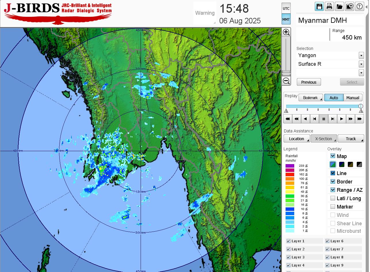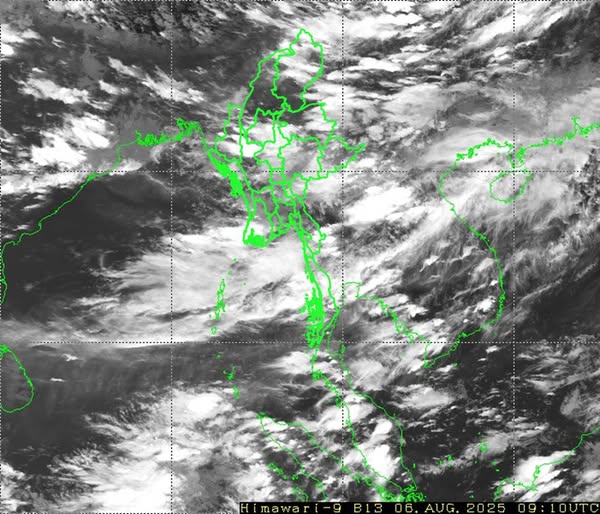 မိုးတိမ်တောင်ဖြစ်ပေါ်မှုအခြေအနေ။ မန္တလေးတိုင်းဒေသကြီး၊ မကွေးတိုင်းဒေသကြီး၊ စစ်ကိုင်းတိုင်းဒေသကြီးအောက်ပိုင်း၊ ဧရာဝတီတိုင်းဒေသကြီး၊ တနင်္သာရီတိုင်းဒေသကြီး၊ ကချင်ပြည်နယ်၊ ကယားပြည်နယ်၊ ကရင်ပြည်နယ်၊ မွန်ပြည်နယ်နှင့် ရှမ်းပြည်နယ်တို့တွင် မိုးတိမ်တောင်များ ဖြစ်ထွန်းလျက်ရှိပြီး၊ အဆိုပါ မိုးတိမ်တောင်များ ရွေ့လျားရာနေရာတစ်လျှောက်တွင် မိုးရွာသွန်းခြင်းနှင့်အတူ လေပြင်းတိုက်ခတ်ခြင်း၊ မိုးထစ်ချုန်းခြင်း၊ မိုးကြိုးပစ်ခြင်း၊ လျှပ်စီးလက်ခြင်းနှင့် မိုးသီးကြွေခြင်းစသည့် မိုးလေဝသဖြစ်စဉ်များ ဖြစ်ပေါ်နိုင်ပါသဖြင့် ကြိုတင်သတိပြုနိုင်ပါရန် အကြံပြုအပ်ပါသည်။