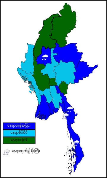 နောက် ၂ ရက်အတွက်ခန့်မှန်းချက်။ မန္တလေးတိုင်းဒေသကြီး၊ စစ်ကိုင်းတိုင်းဒေသကြီးအောက်ပိုင်း၊ တနင်္သာရီတိုင်းဒေသကြီး၊ ကရင်ပြည်နယ်၊ ချင်းပြည်နယ်၊ မွန်ပြည်နယ်နှင့် ရှမ်းပြည်နယ်တို့တွင် မိုးပိုလာမည်။