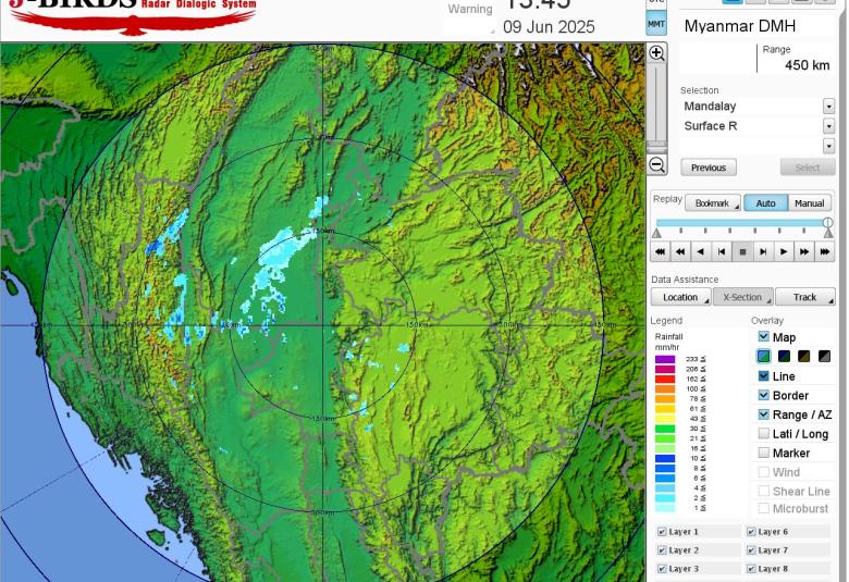 မိုးတိမ်တောင်ဖြစ်ပေါ်မှုအခြေအနေ။ ရန်ကုန်တိုင်းဒေသကြီး၊ မန္တလေးတိုင်းဒေသကြီး၊ ပဲခူးတိုင်းဒေသကြီး၊ စစ်ကိုင်းတိုင်းဒေသကြီး၊ ဧရာဝတီတိုင်းဒေသကြီး၊ တနင်္သာရီတိုင်းဒေသကြီး၊ ကချင်ပြည်နယ်၊ ချင်းပြည်နယ်နှင့် ရှမ်းပြည်နယ်တို့တွင် မိုးတိမ်တောင်များ ဖြစ်ထွန်းလျက်ရှိပြီး၊ အဆိုပါ မိုးတိမ်တောင်များ ရွေ့လျားရာနေရာတစ်လျှောက်တွင် မိုးရွာသွန်းခြင်းနှင့်အတူ လေပြင်းတိုက်ခတ်ခြင်း၊ မိုးထစ်ချုန်းခြင်း၊ မိုးကြိုးပစ်ခြင်း၊ လျှပ်စီးလက်ခြင်းနှင့် မိုးသီးကြွေခြင်းစသည့် မိုးလေဝသဖြစ်စဉ်များ ဖြစ်ပေါ်နိုင်ပါသဖြင့် ကြိုတင်သတိပြုနိုင်ပါရန် အကြံပြုအပ်ပါသည်။