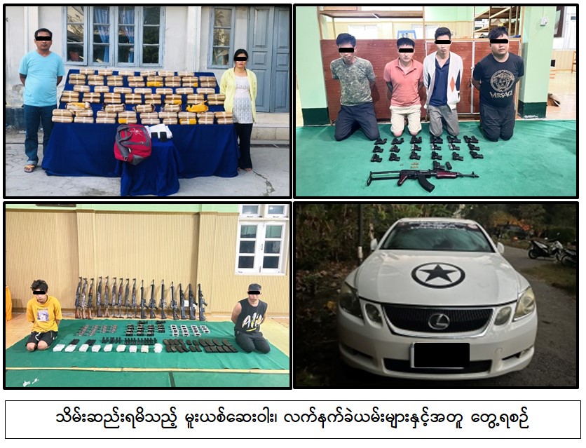 ကွင်းဆက် ဖော်ထုတ်ချက်အရ ယင်းနေ့ည ၉ နာရီခွဲတွင် မြဝတီမြို့၊ အမှတ်(၅)ရပ်ကွက်၊ မြတ်လင်းအေးမြိုင်လမ်းရှိ တည်းခိုခန်းကို ဝင်ရောက်ရှာဖွေရာ စိုင်းလောင်ခမ်း (ခ) ဝမ်ရှီတာ (ခ) ဝတုတ်၊ နေထွန်းလှ (ခ) အိုက်ရင်၊ အောင်ကိုထွေး (ခ) ကိုစိုင်း နှင့် ကျင်ချန်း (ခ) လီကျင်ချန်းတို့ လေးဦးကို ပစ္စတိုသေနတ် ၁၉ လက်၊ ၎င်းကျည်အိမ် ၂၄ ခု၊ AK-47 သေနတ် တစ်လက်၊ ၎င်းကျည်အိမ် တစ်ခု၊ 9MM ကျည် ၁၆ တောင့်နှင့် LEXUS မော်တော်ယာဉ် တစ်စီးတို့ကို သိမ်းဆည်းရမိခဲ့ကြောင်း၊ ထပ်မံစစ်ဆေး ဖော်ထုတ်ချက်အရ မြဝတီမြို့၊ အမှတ်(၄)ရပ်ကွက်၊ အောင်ဓနလမ်းရှိ အဟုန် ၏ နေအိမ်ကို ဝင်ရောက်ရှာဖွေရာ ရဲထက်ကျော် (ခ) ကျန်ချင်ဟိန်း နှင့် ဟိန်းဆွေ (ခ) ကွမ်ထုန် (ခ) ကတုံး တို့ နှစ်ဦးကို အိုက်စ် သုံးကီလို၊ စိတ်ပြောင်းဆေးဝါး ကက်တမင်း သုည ဒသမ ၉ ကီလို၊ ၁၂ ဗို့သေနတ် သုံးလက်၊ ၎င်းကျည်အိမ် ကိုးခု၊ ကာဘိုင် လေးလက်၊ AK-47 ကိုးလက်၊ ၎င်းကျည်အိမ် ရှစ်ခု၊ ပစ္စတိုသေနတ် နှစ်လက်၊ ၎င်းကျည်အိမ် လေးခု၊ ပစ္စတိုအသံတိတ်ကိရိယာ သုံးခု၊ ဆက်စပ်ကိရိယာများနှင့် ကျည်မျိုးစုံ အတောင့် ၂,၂၀၀ တို့ကို ထပ်မံသိမ်းဆည်းရမိခဲ့သည်။ ဆက်လက်စစ်ဆေးဖော်ထုတ်ချက်အရ သိမ်းဆည်းရမိ မူးယစ်ဆေးဝါးများကို ရှမ်းပြည်နယ်မှ ကရင်ပြည်နယ်၊ မြဝတီမြို့သို့လည်းကောင်း၊ သိမ်းဆည်းရမိ လက်နက်/ ခဲယမ်းများကို ကရင်ပြည်နယ်၊ မြဝတီမြို့မှ ရှမ်းပြည်နယ်၊ လားရှိုးမြို့သို့လည်းကောင်း သယ်ဆာင်ခြင်းဖြစ်ကြောင်း သိရသဖြင့် ၎င်းတို့အား ဥပဒေအရ အရေးယူထားရှိပြီး ကွင်းဆက်ပြစ်မှု ကျူးလွန်သူများကို ဆက်လက်စစ်ဆေး ဖော်ထုတ်လျက်ရှိကြောင်းသည်။